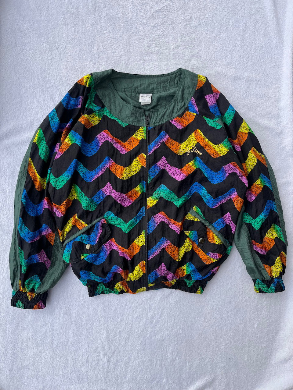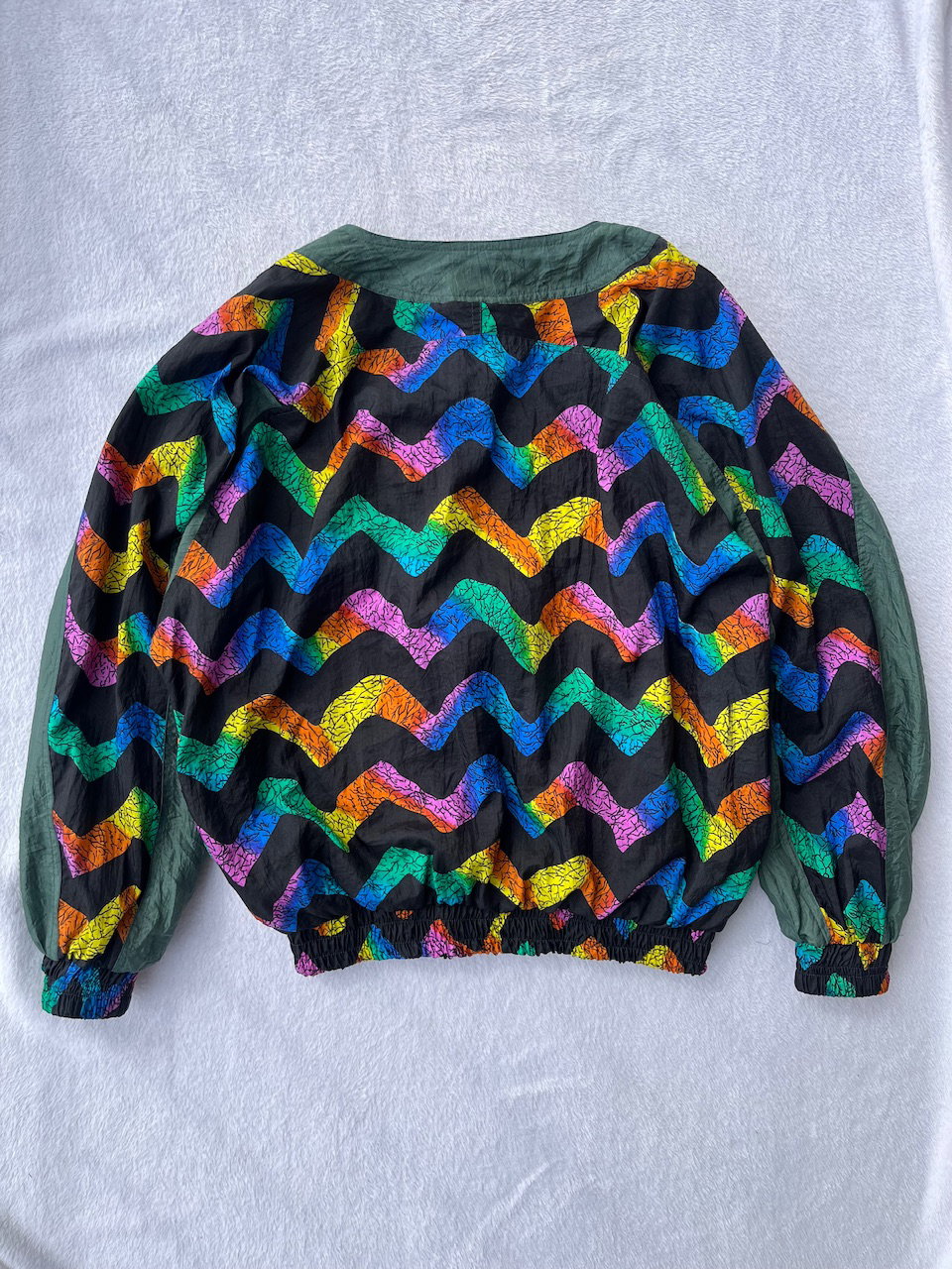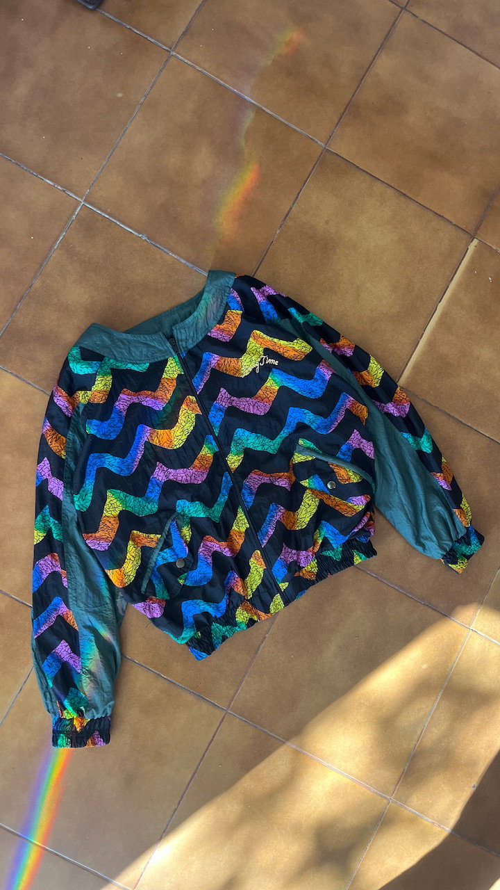 rompevientos de estampa arcoíris combinado con verde musgo. es original de los 80s esta forrado en algodón y tiene bolsillos. es de corte mangas murciélago. no tiene hombreras