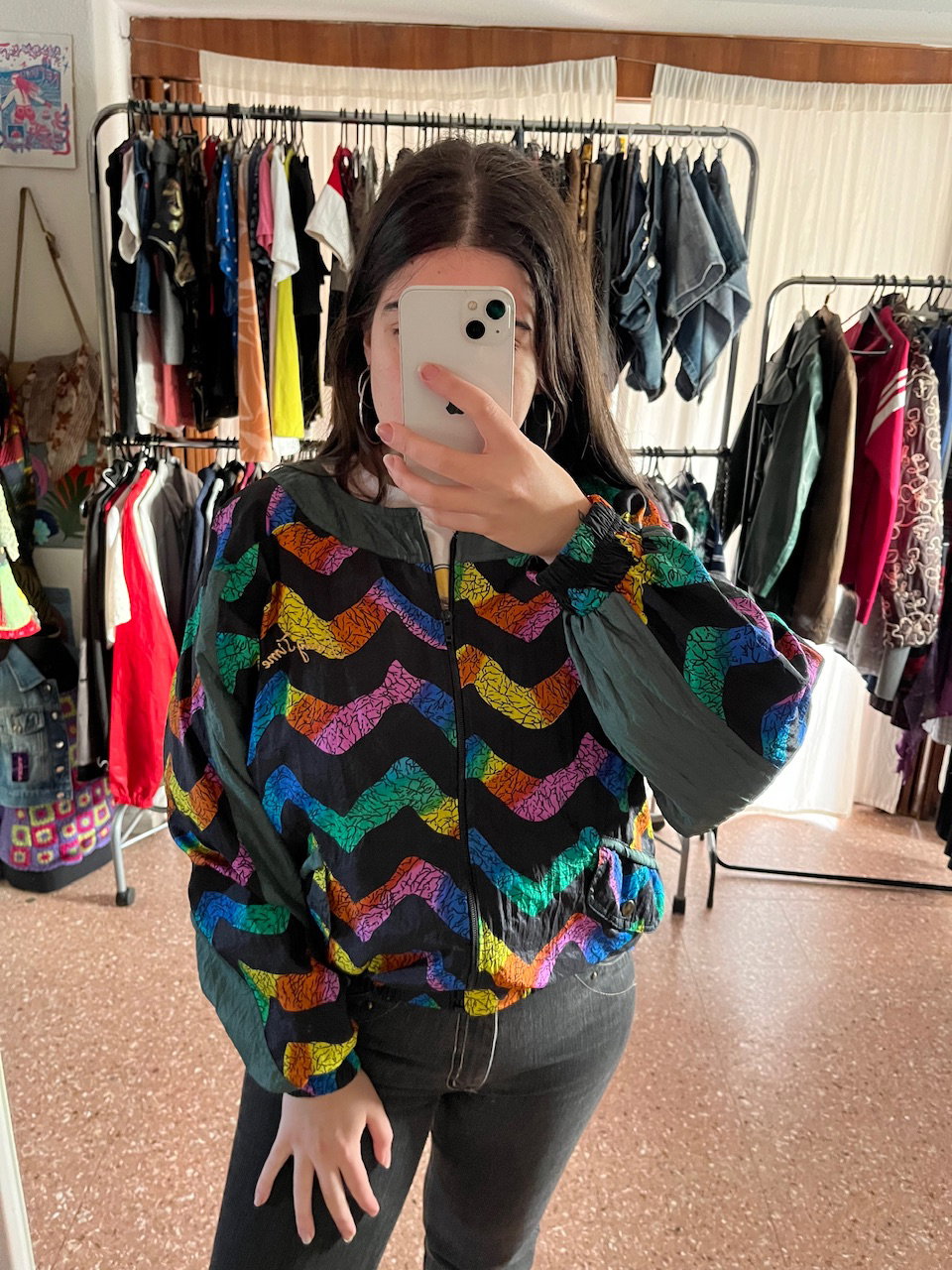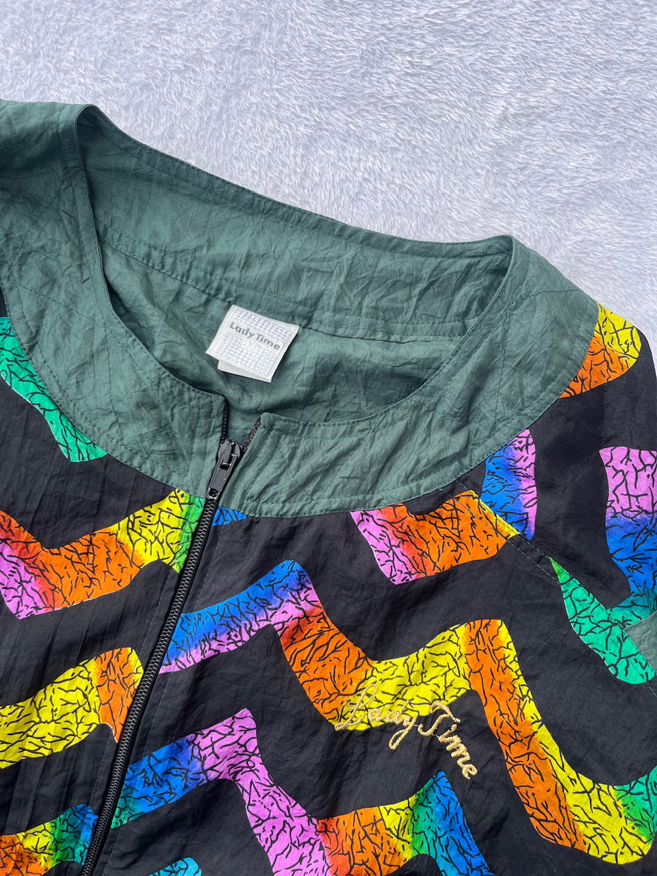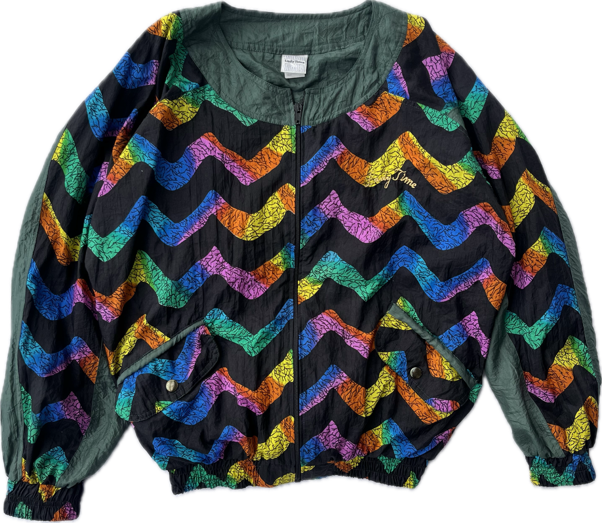 rompevientos de estampa arcoíris combinado con verde musgo. es original de los 80s esta forrado en algodón y tiene bolsillos. es de corte mangas murciélago. no tiene hombreras
