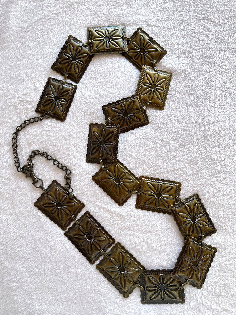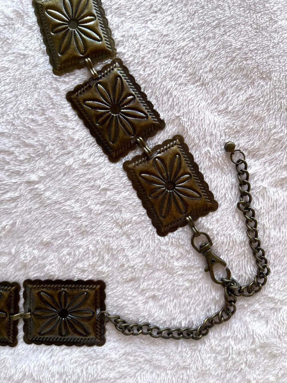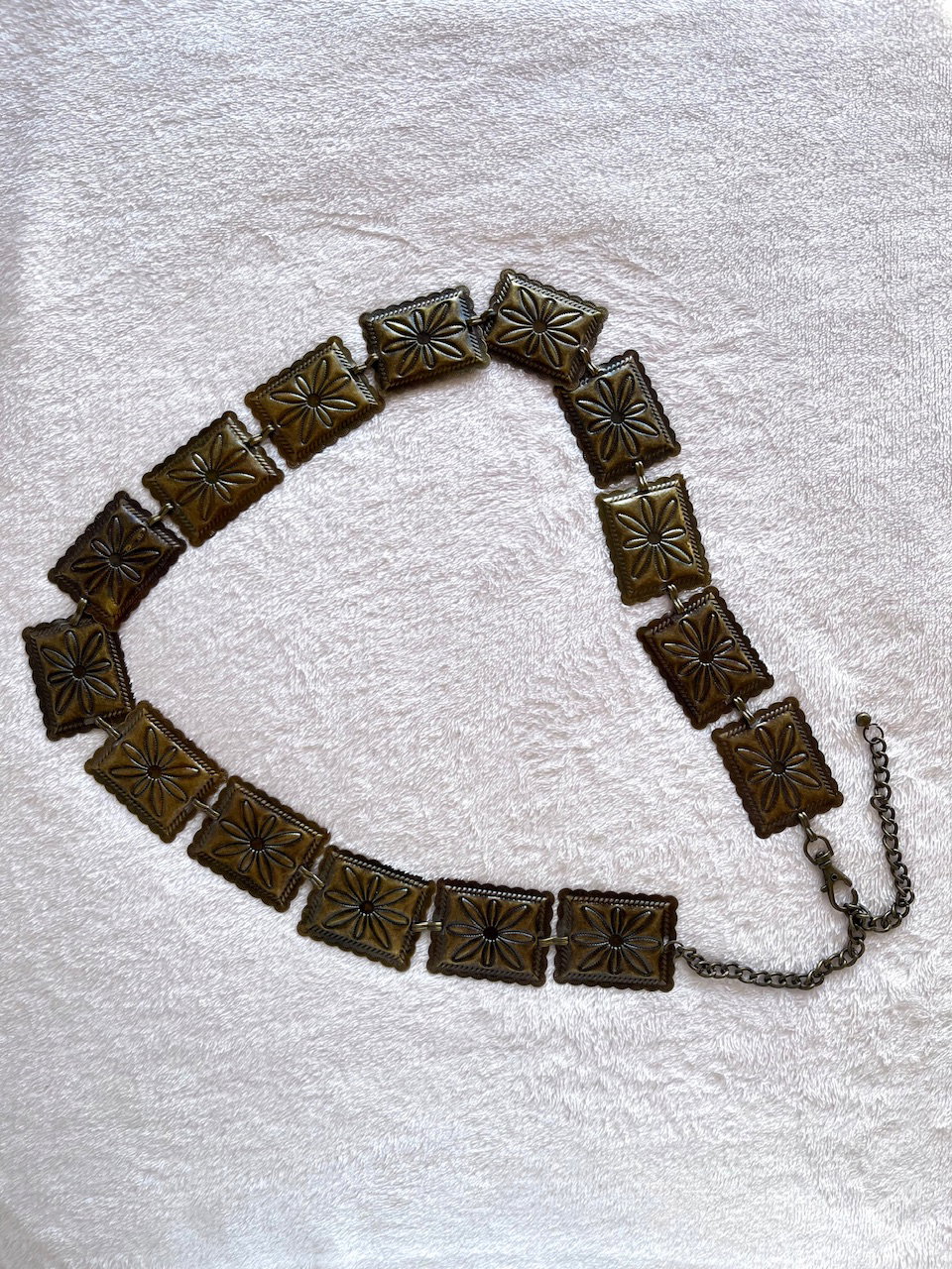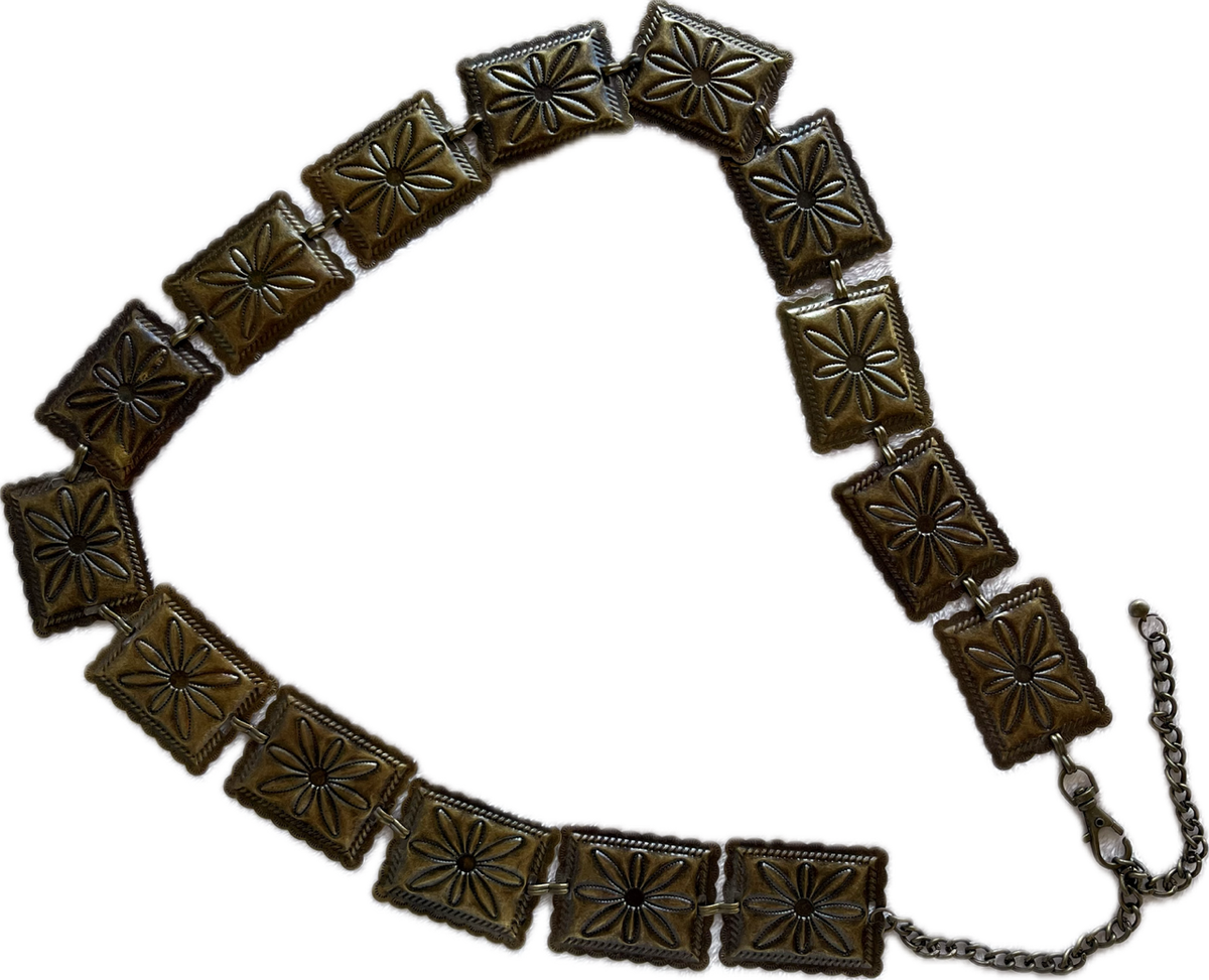 cinturón tipo caderón metálico con flores labradas. es una preciosura