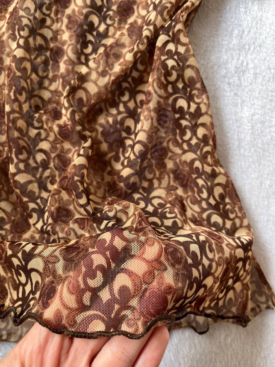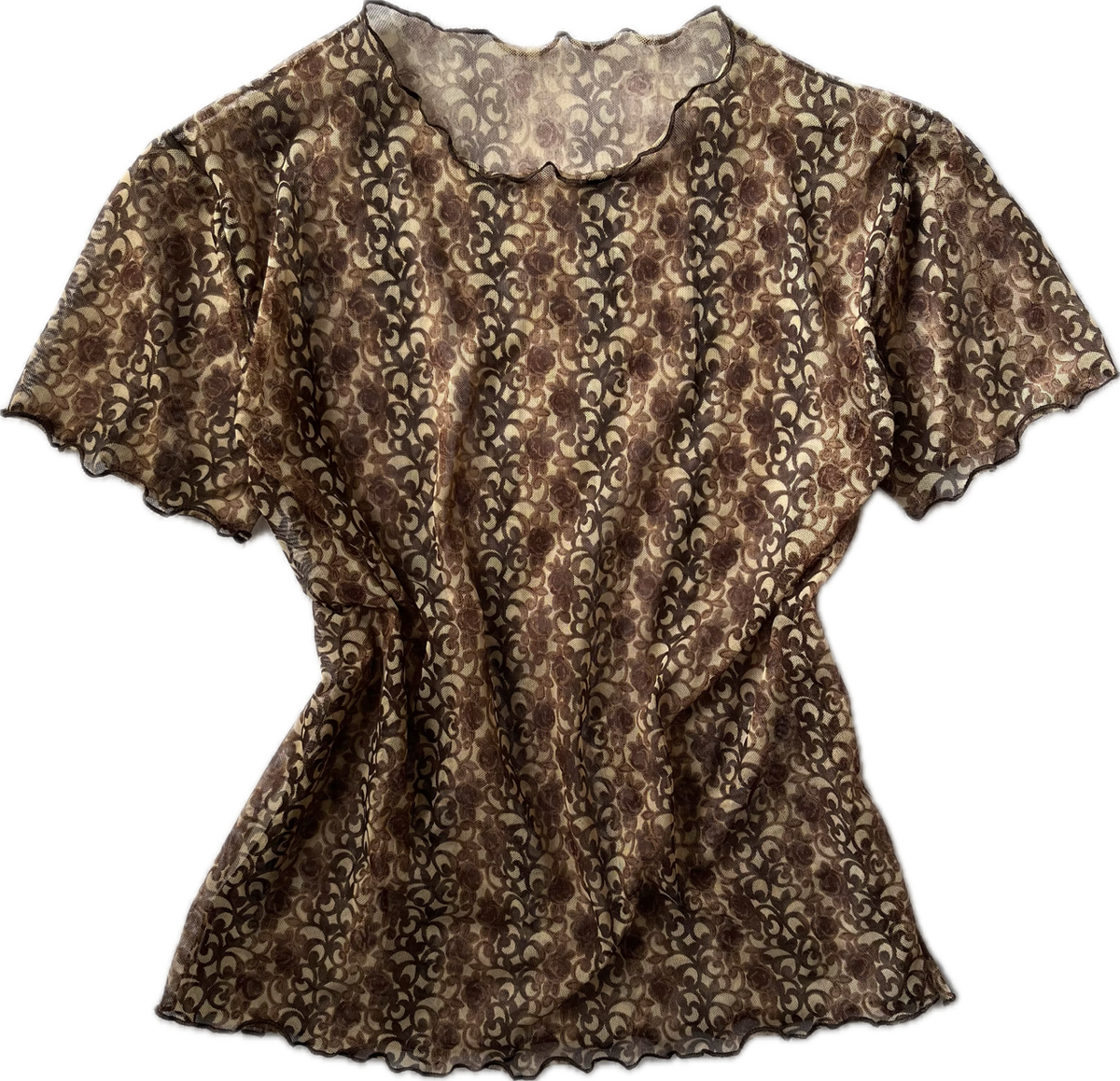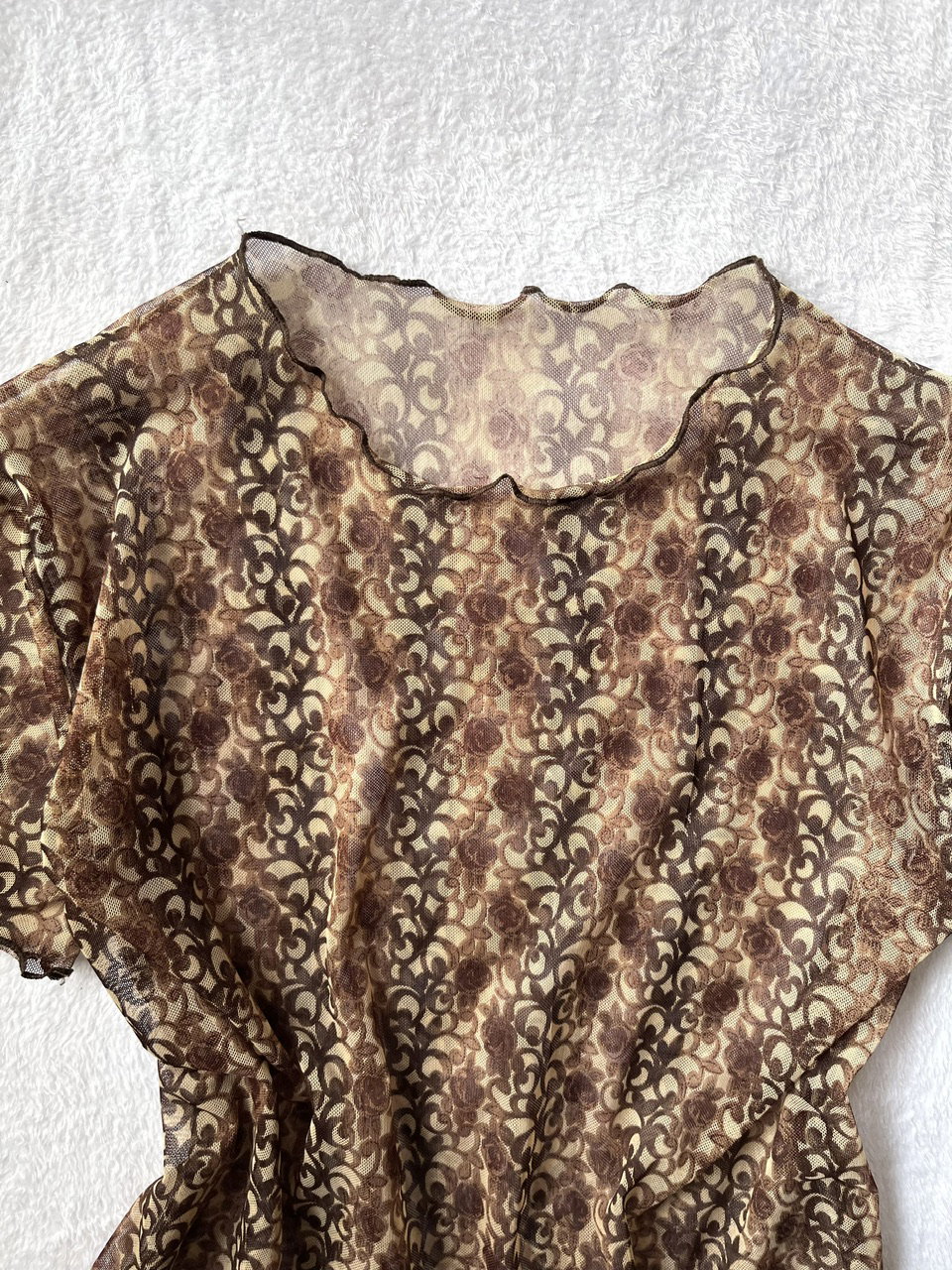 tee de microtul talle xl para que quede al cuerpo o puede usarse oversize. es vintage, de ahí el estampado de rosas en distintas tonalidades de marrón y las terminaciones en rulitos. el microtul es gruesito