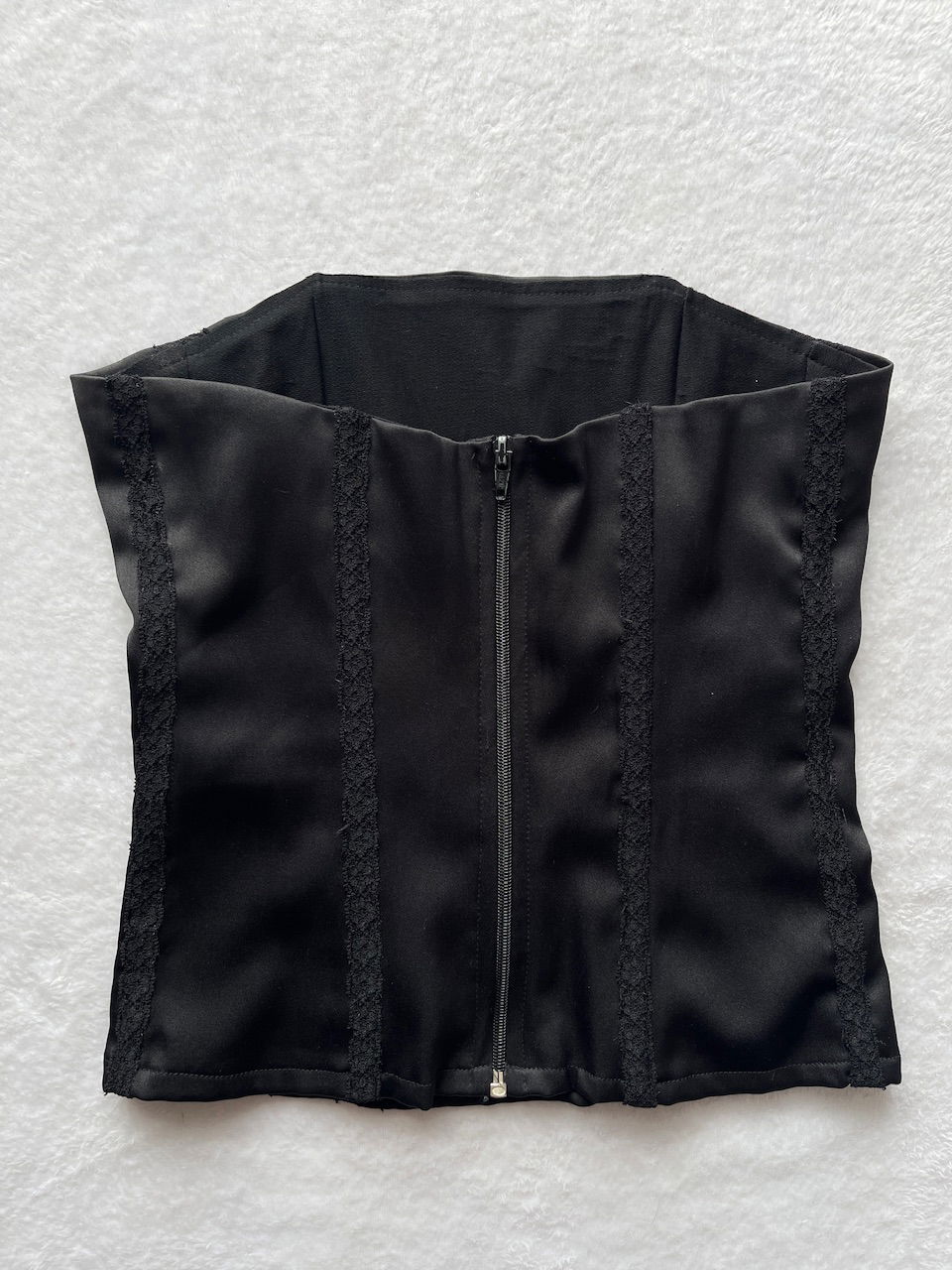 de tela tipo raso con detalles de encaje y moñitos tiene varillas