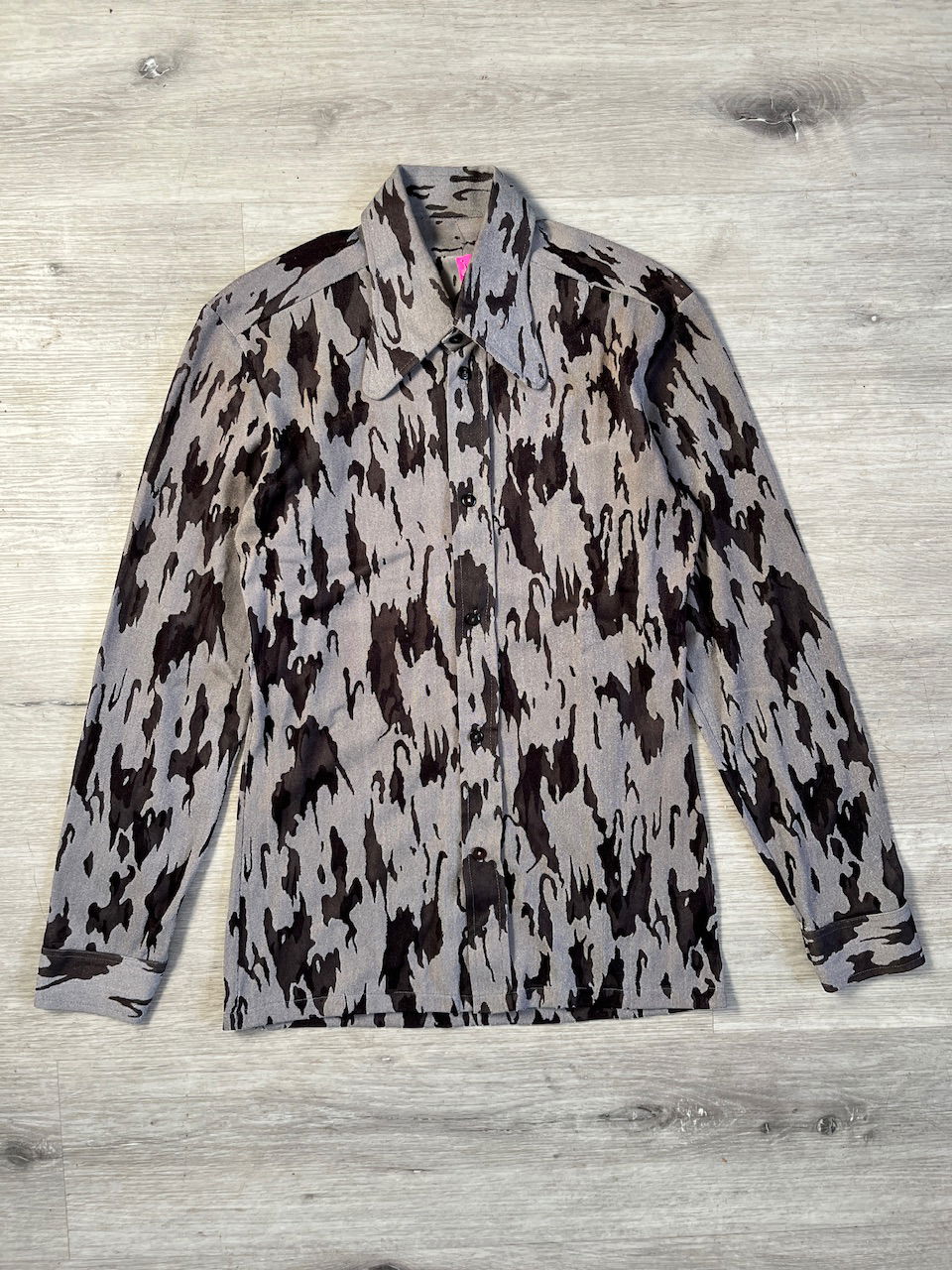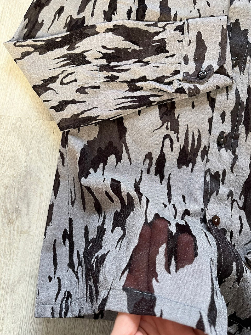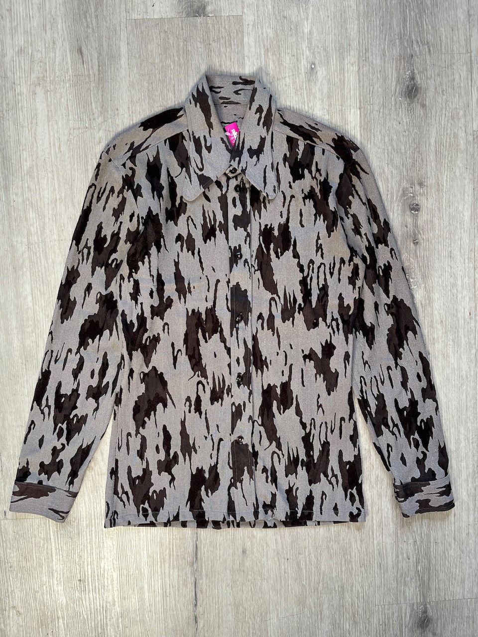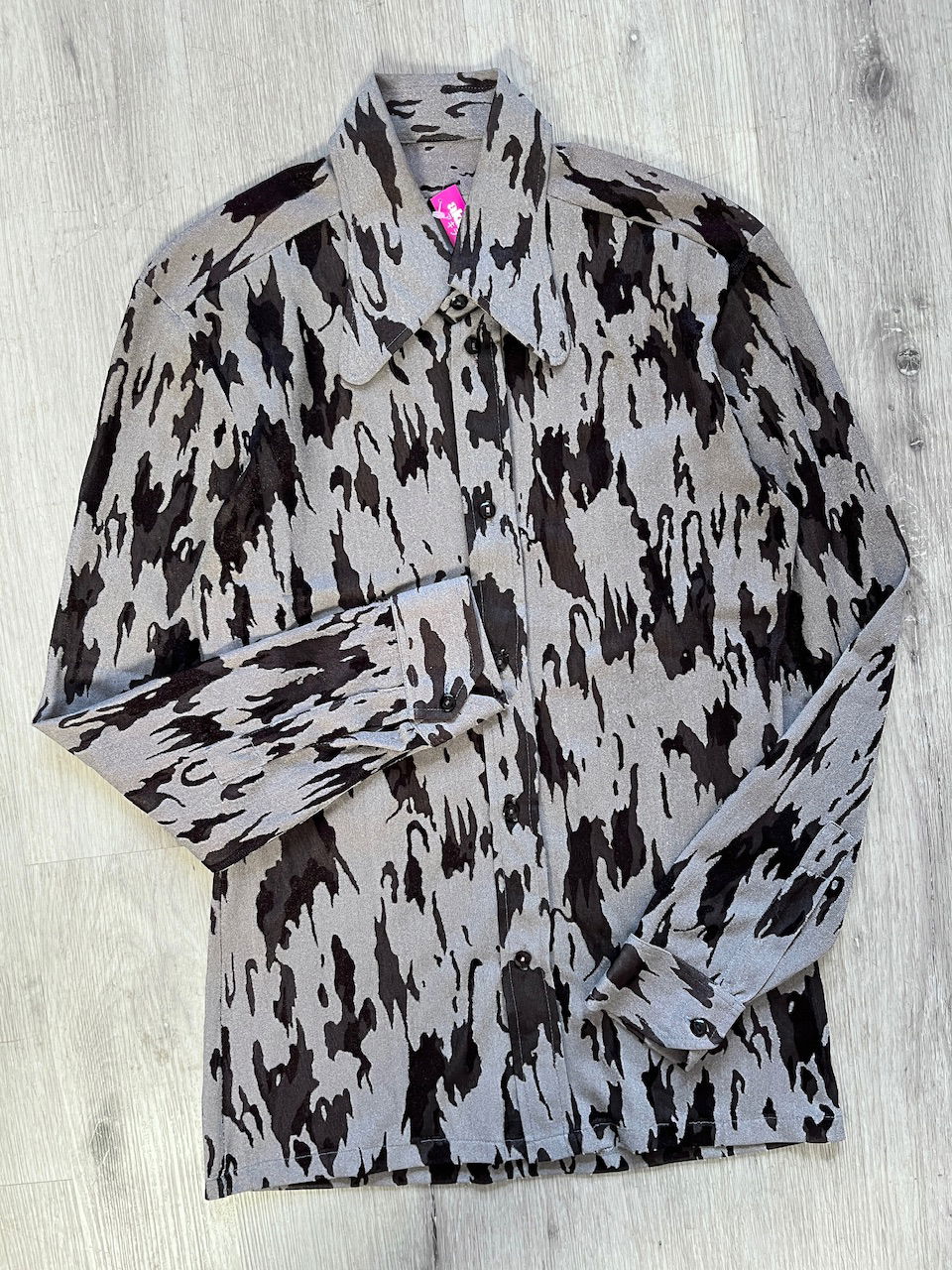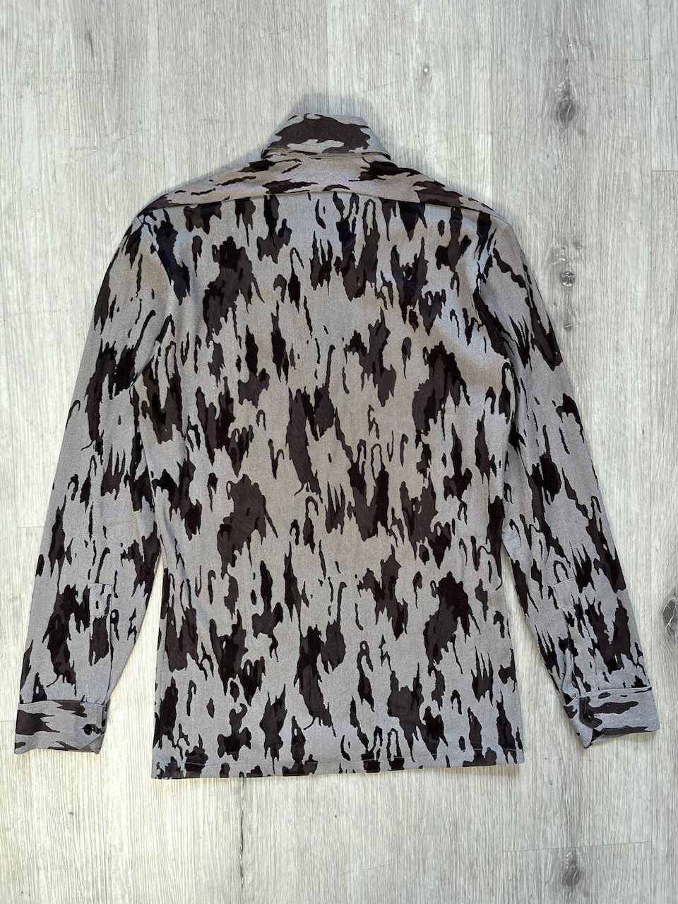 camisa de mesh y lurex con trasparencias, en color gris y negro