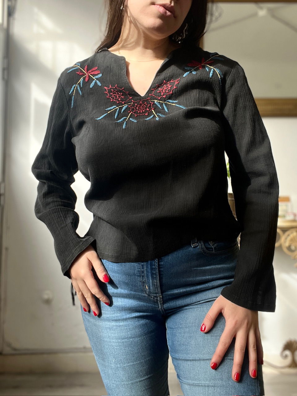 blusa bordada estilo mexicano. se puede ajustar en las mangas. es de algodon con textura, tipo lino talle m MEDIDAS (lado a lado) 45cm hmbr a hmbr 56cm ax a ax 58cm largo 57cm largo de manga