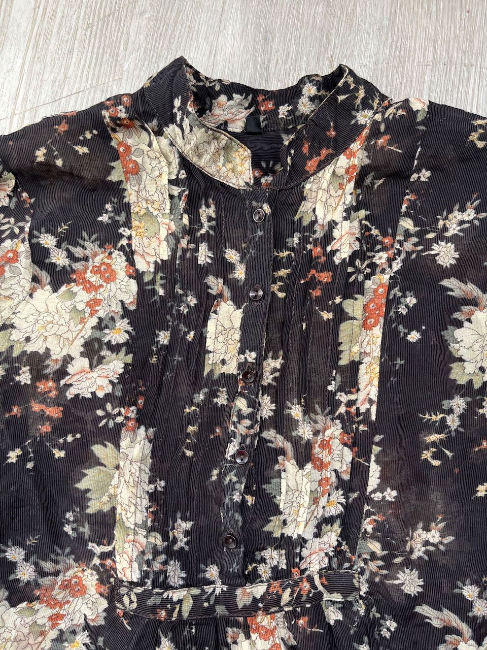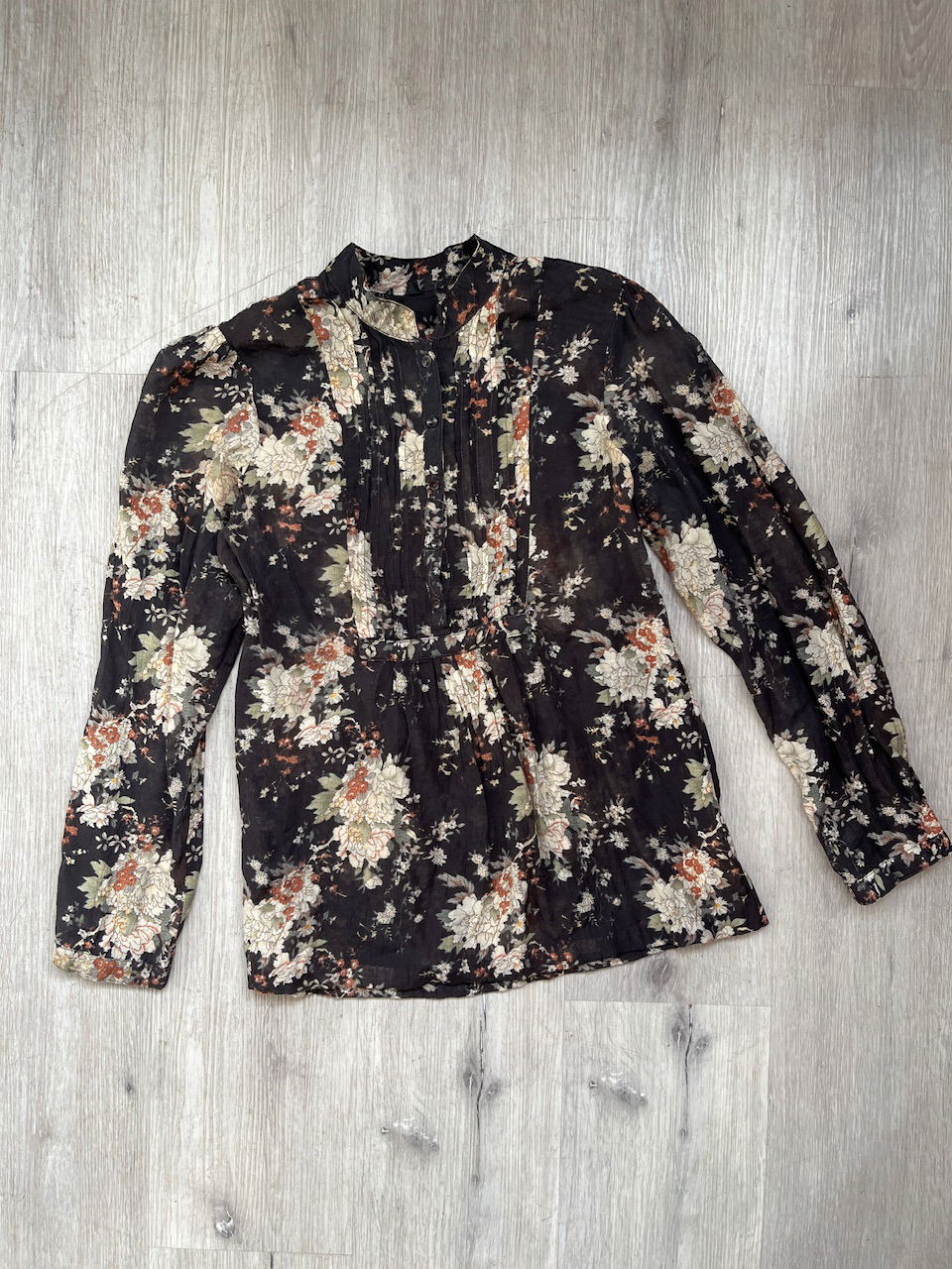 blusa con una estampa hermosa de peonias y flores, cuenta con cuello mao y tablitas en el busto con botones funcionales. aprox talle m MEDIDAS (lado a lado) 36cm hmbr a hmbr 48cm ax a ax 65cm largo 60cm largo de manga