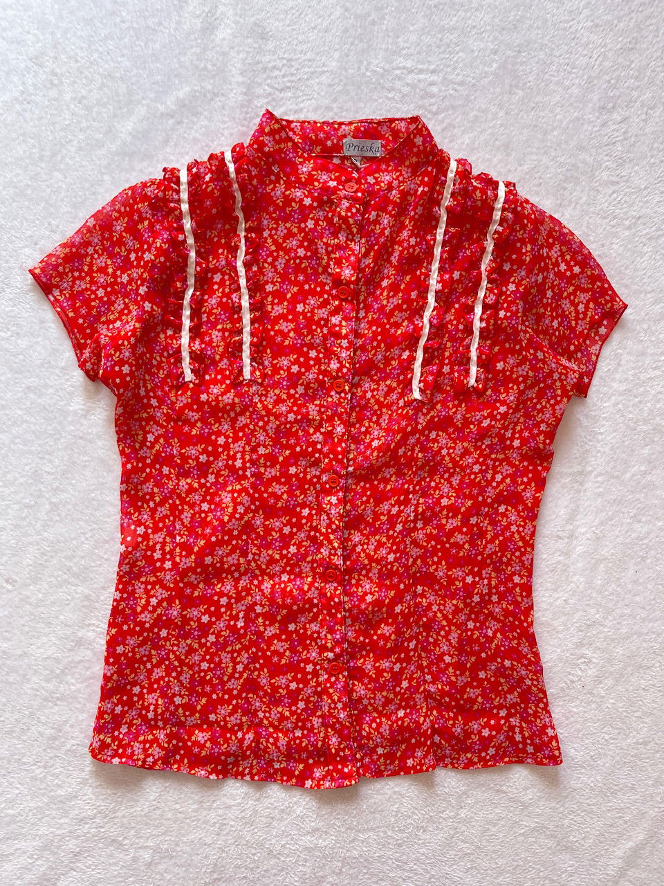 camisa hermosa con bolados y cuello mao, de gasa con estampa floral. talle m aprox. como nueva, impecable estado MEDIDAS (lado a lado) 33cm hmbr a hmbr - 46cm ax a ax - 60cm largo