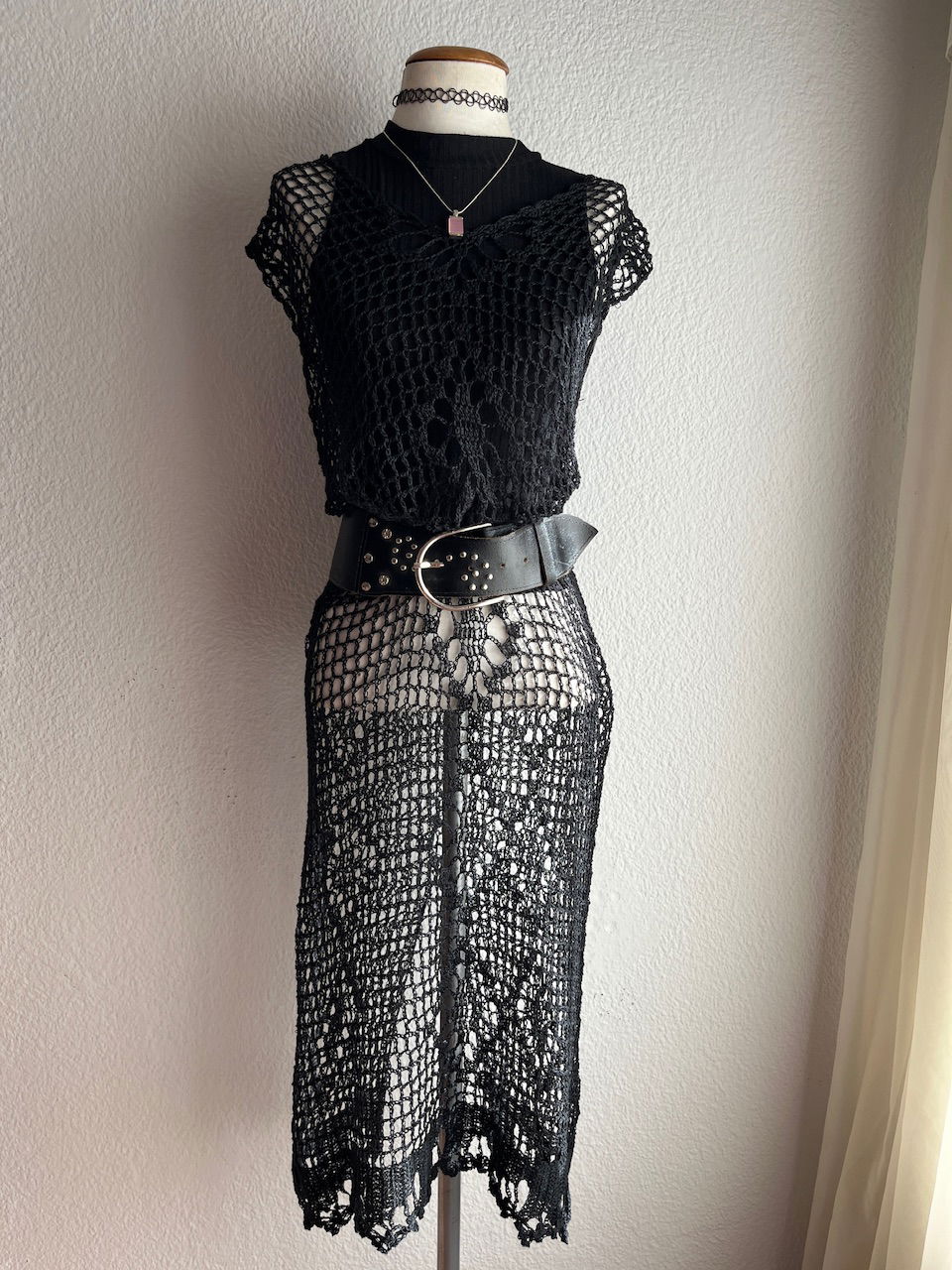 vestido de crochet tejido a mano. en hilo acrilico. abarca varios talles hasta un L. como nuevo MEDIDAS (lado a lado) 50cm hmbr a hmbr - 22cm sisa - 46cm ax a ax - 112cm largo