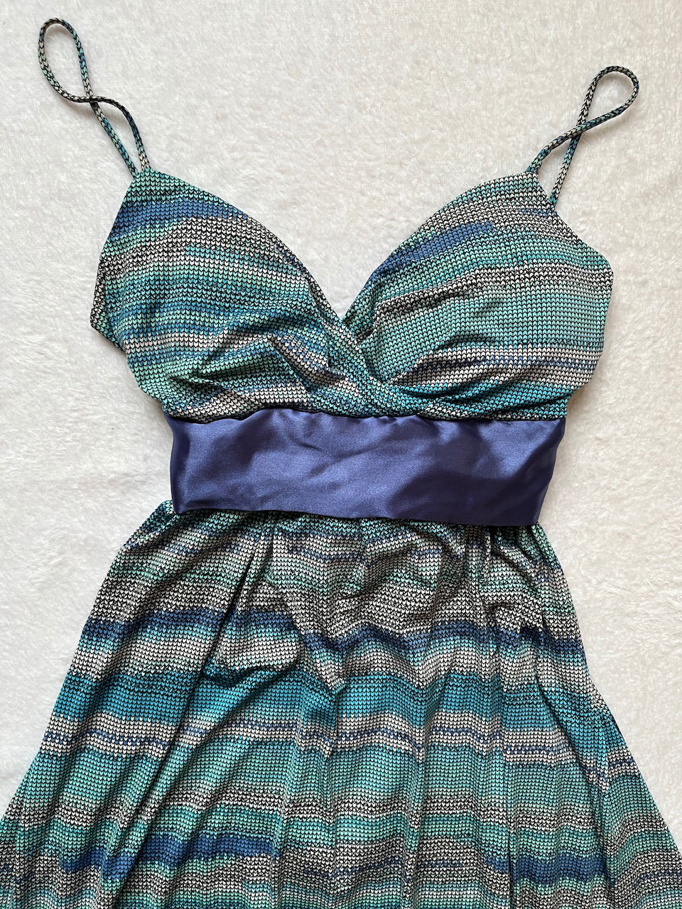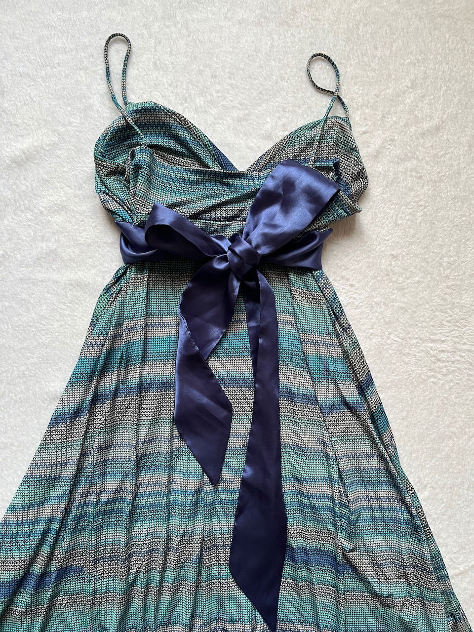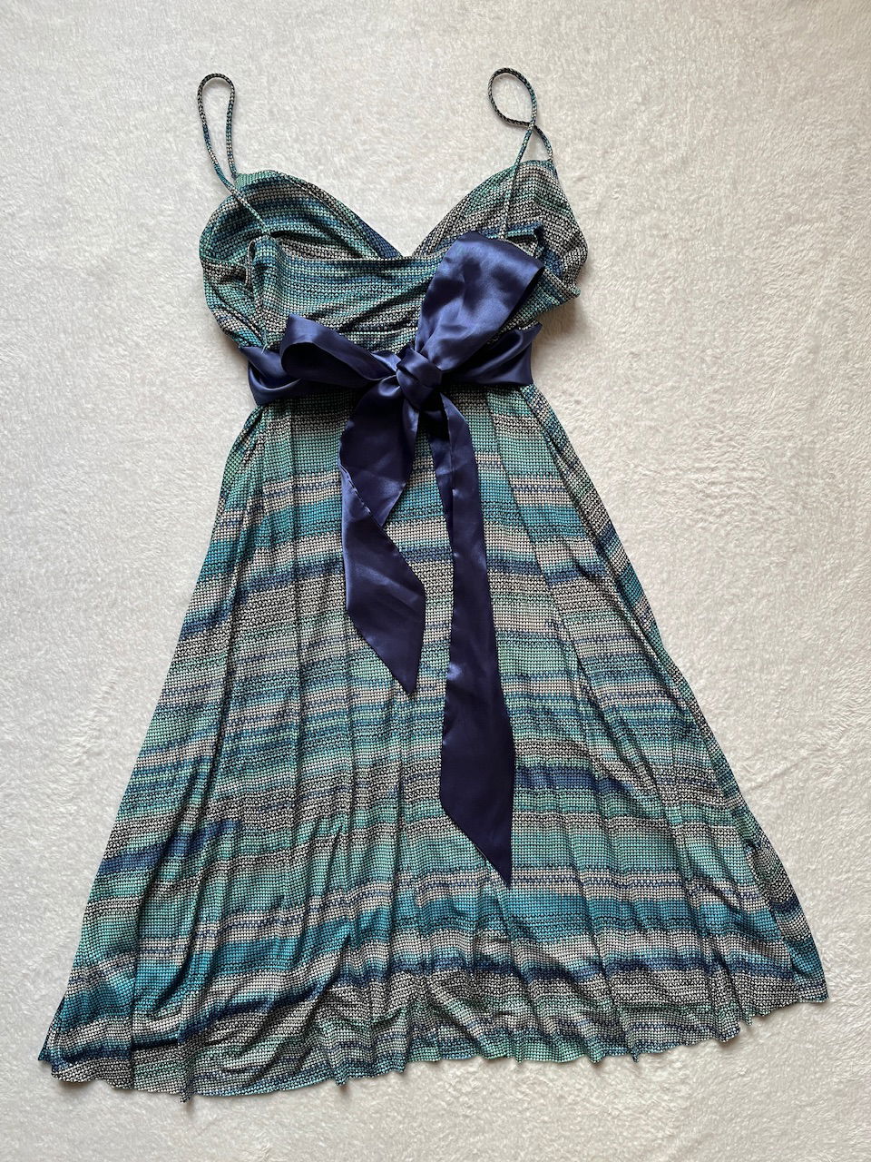 vestido original de los 00s con lazo, tiene tasas y se puede ajustar en la cintura. es de seda fria. talle m aprox. como nuevo MEDIDAS (lado a lado) 28cm hmbr a hmbr - 19cm sisa - 36cm ax a ax - 75cm largo sin las tiras