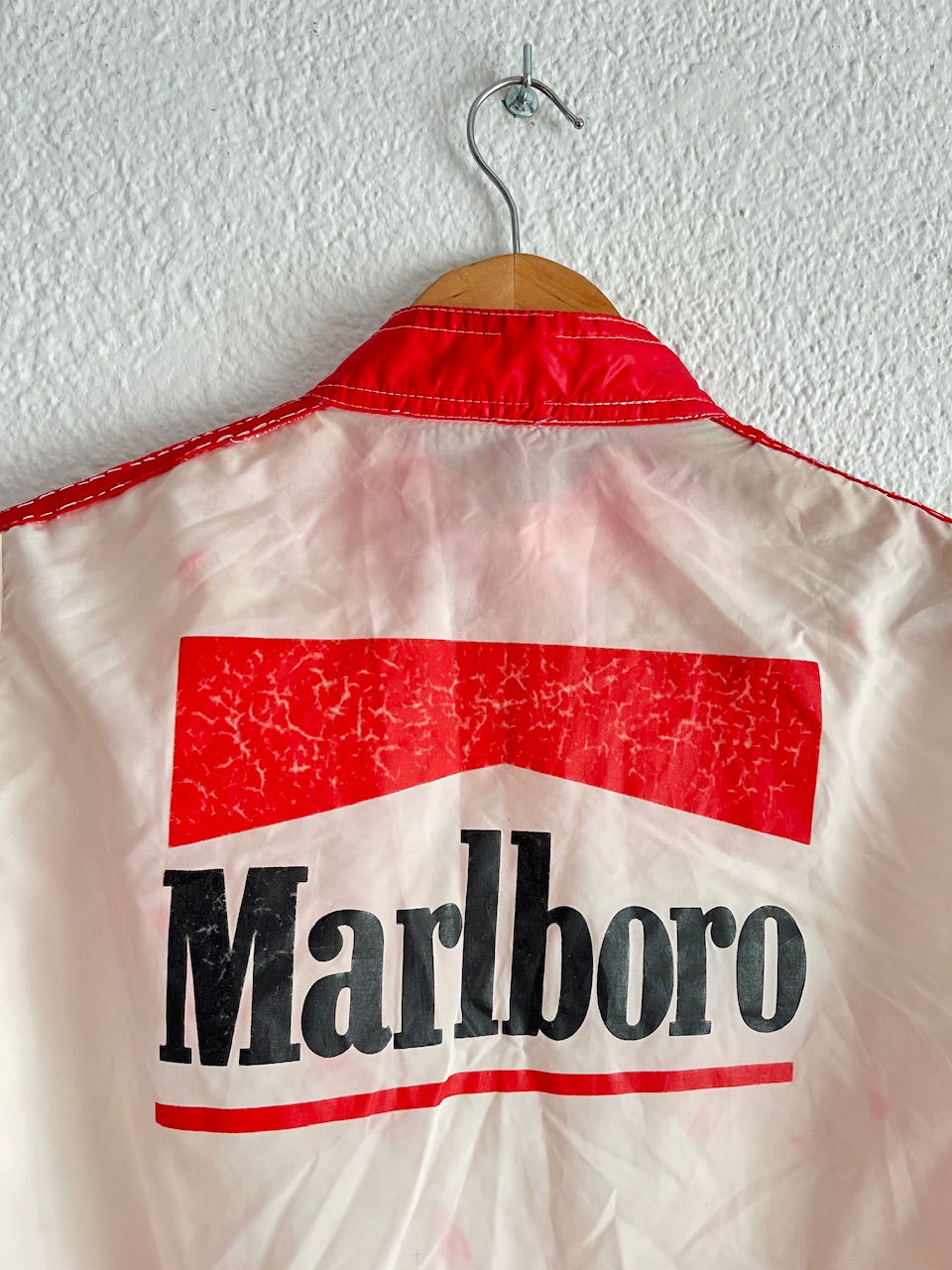 rompevientos marlboro original de los 90s, cuenta con varios bolsillos y estampa en la espalda. tiene varios detalles de terminacion desprolijos y una manchita atras (ver bien las fotos) talle s aprox MEDIDAS (lado a lado) 39cm hmbr a hmbr - 53cm ax a ax - 62cm largo de manga - 58cm largo