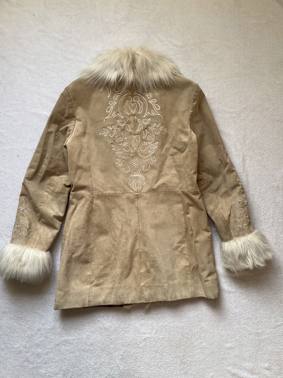 hermoso tapado de gamuza con detalles en piel sintetica y bordado, en mangas y espaldas. cuenta con ganchitos para cerrar tipo "Invisible". es un talle m. original de los 00s. ver detalles de la gamuza en fotos MEDIDAS (lado a lado) 41cm hmbr a hmbr - 53cm ax a ax -77cm largo total -64cm largo de manga
