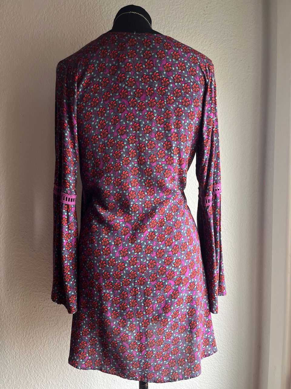 vestido con mangas acampandas, escote en v y detalle de guarda. es de algodon. tiene un hermoso calce. tambien se puede usar de blusa larga MEDIDAS (lado a lado) 40cm hmbr a hmnr - 48cm ax a ax - 55cm largo de manga - 80cm largo total