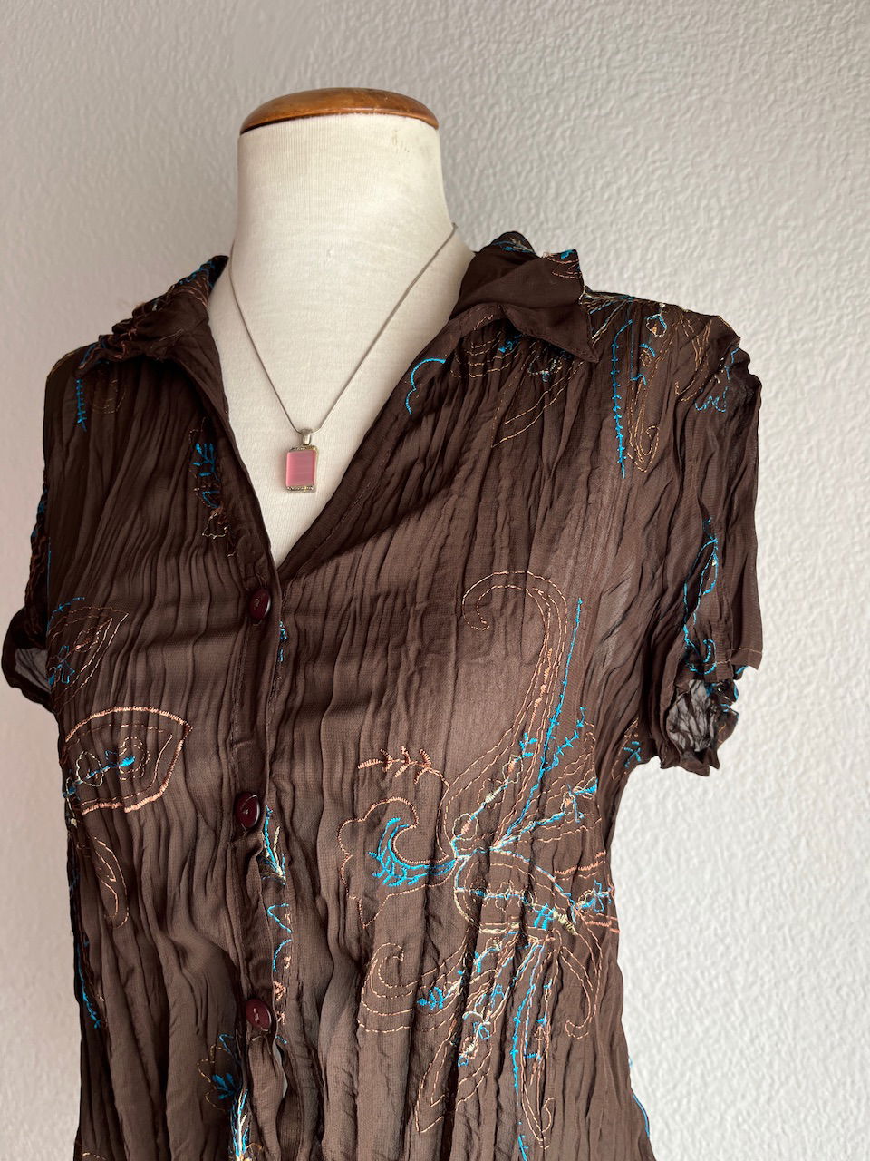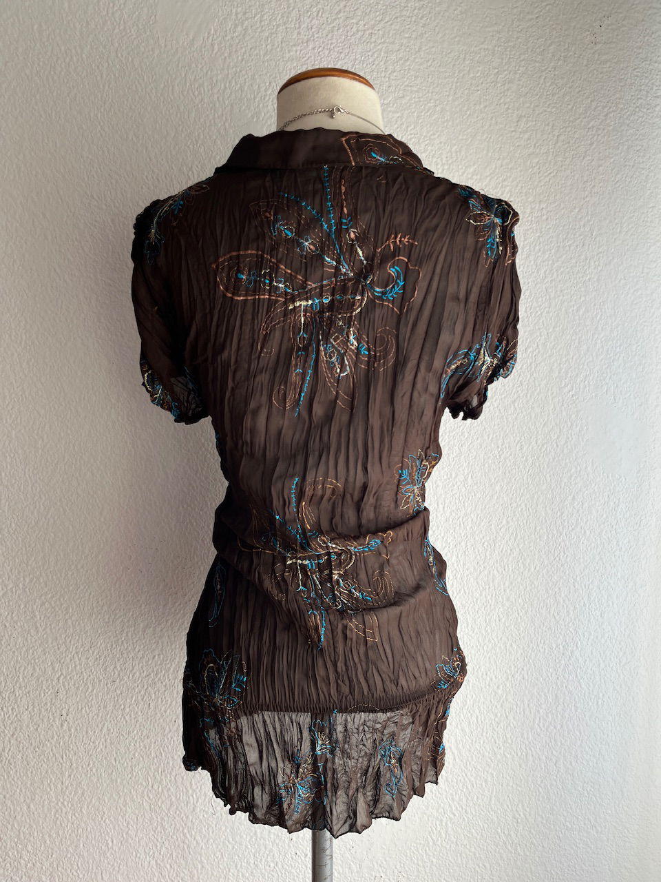 hermosa camisa de creppe trasparente tipo gasa con full bordados, ajustada en la cintura. talle m MEDIDAS (lado a lad) 40cm hmbr a hmbr - 50cm ax a ax - 71cm largo
