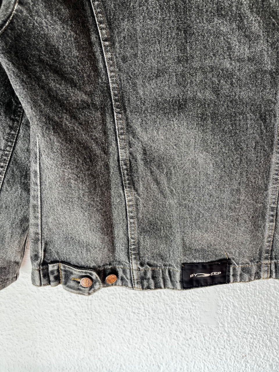 es de jean rígido 100% algodón, cuenta con sus botones originales y varios bolsillos. ver el dobladillo q tiene en las mangas, q no es el original