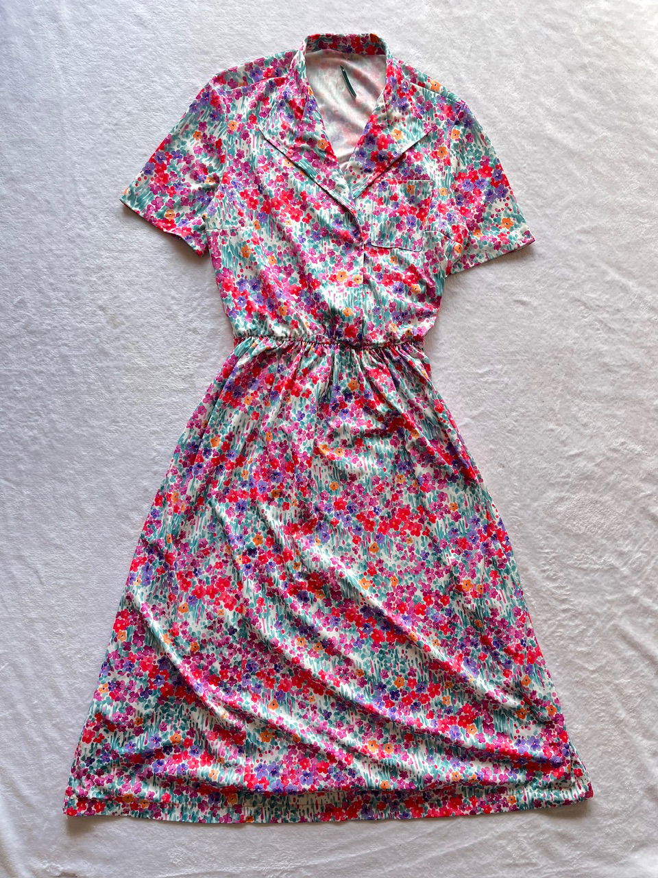 vestido vintage original de los 80s de seda fría estampada, es súper elastizado. con escote en V y cuello camisero, botones funcionales y cintura elástizada. impecable estado - aprox talle m