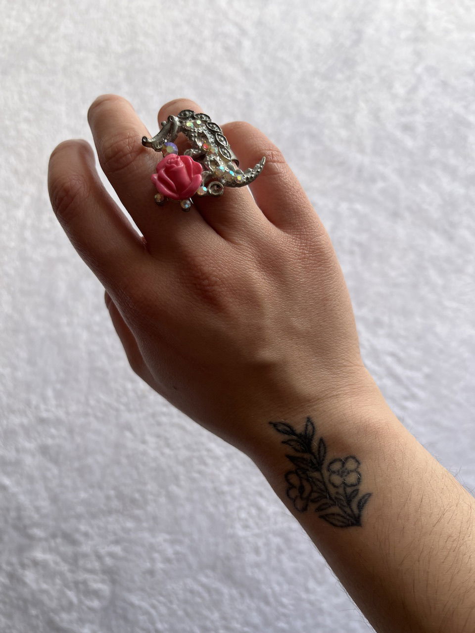 anillo de crocodrilo con rosa y strass. tamaño mediano. regulable