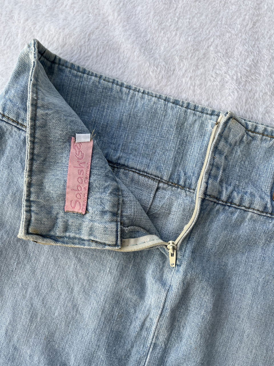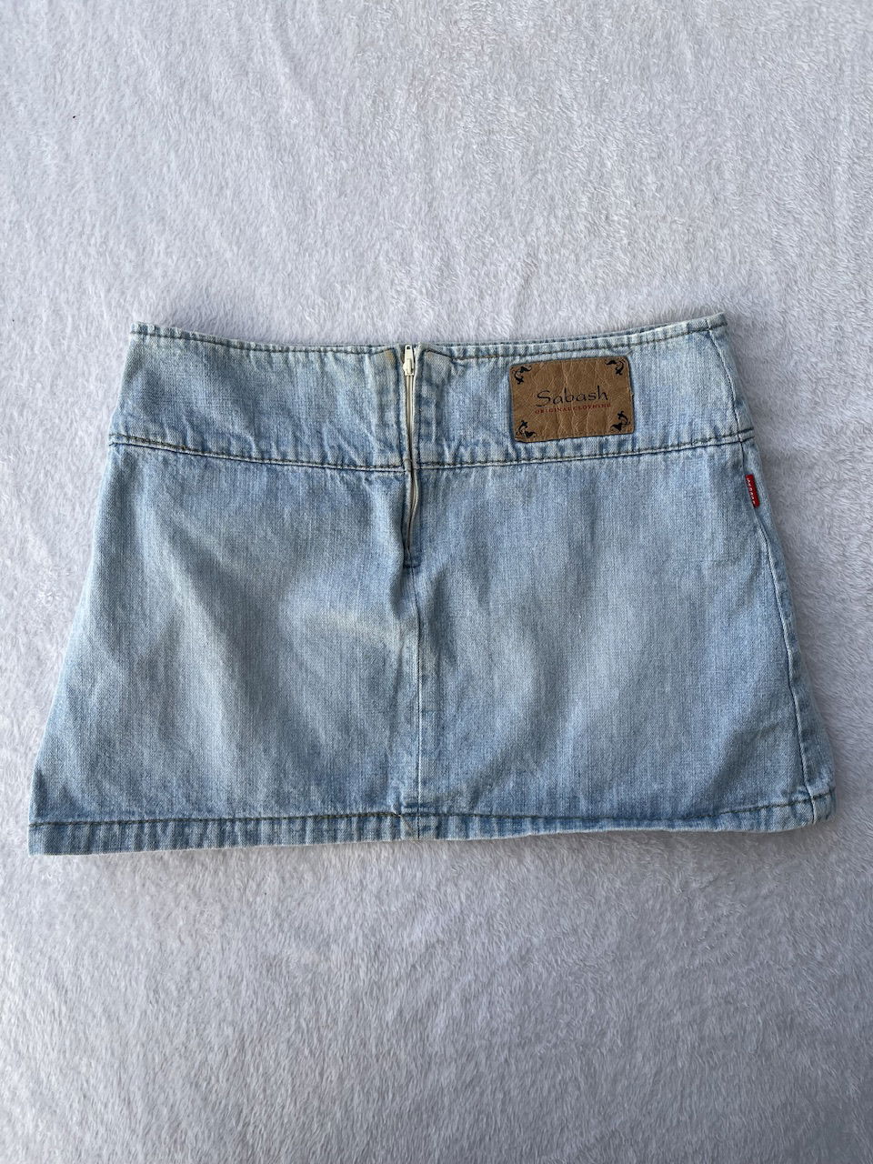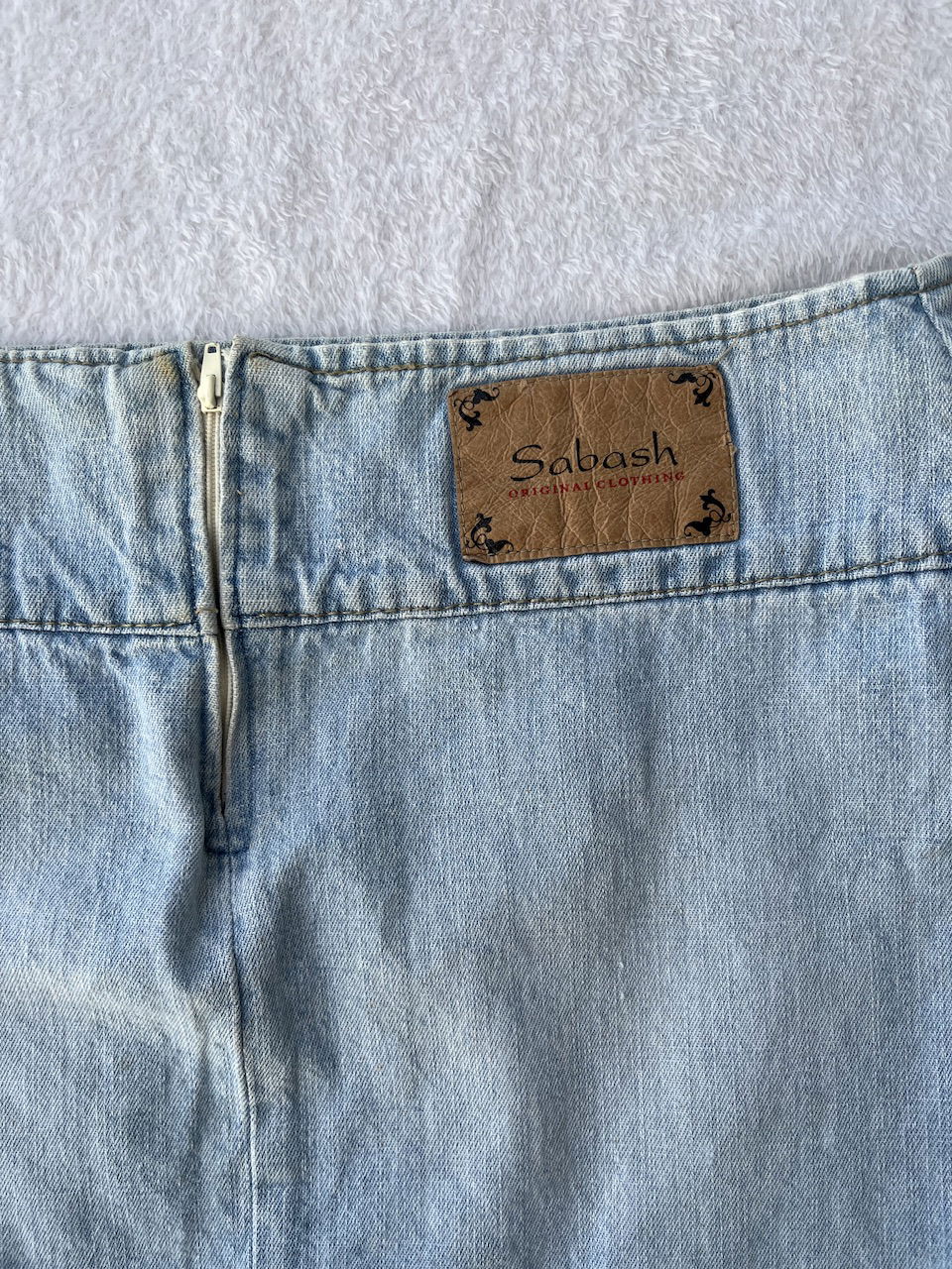 mini de jean original de los 2000s. cuentaa con strass y unas tablitas pro delante. talle 1/34