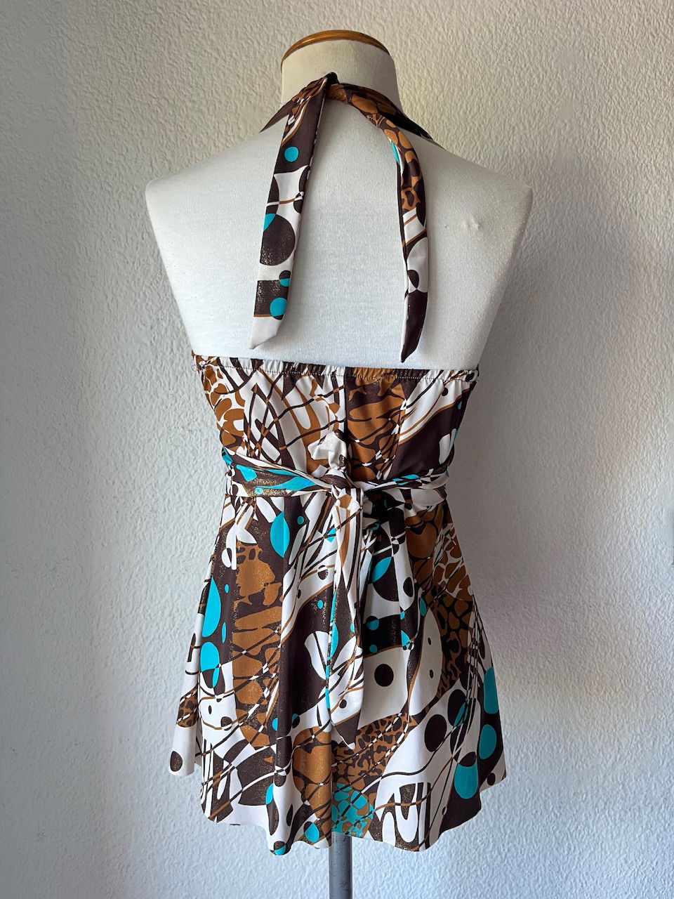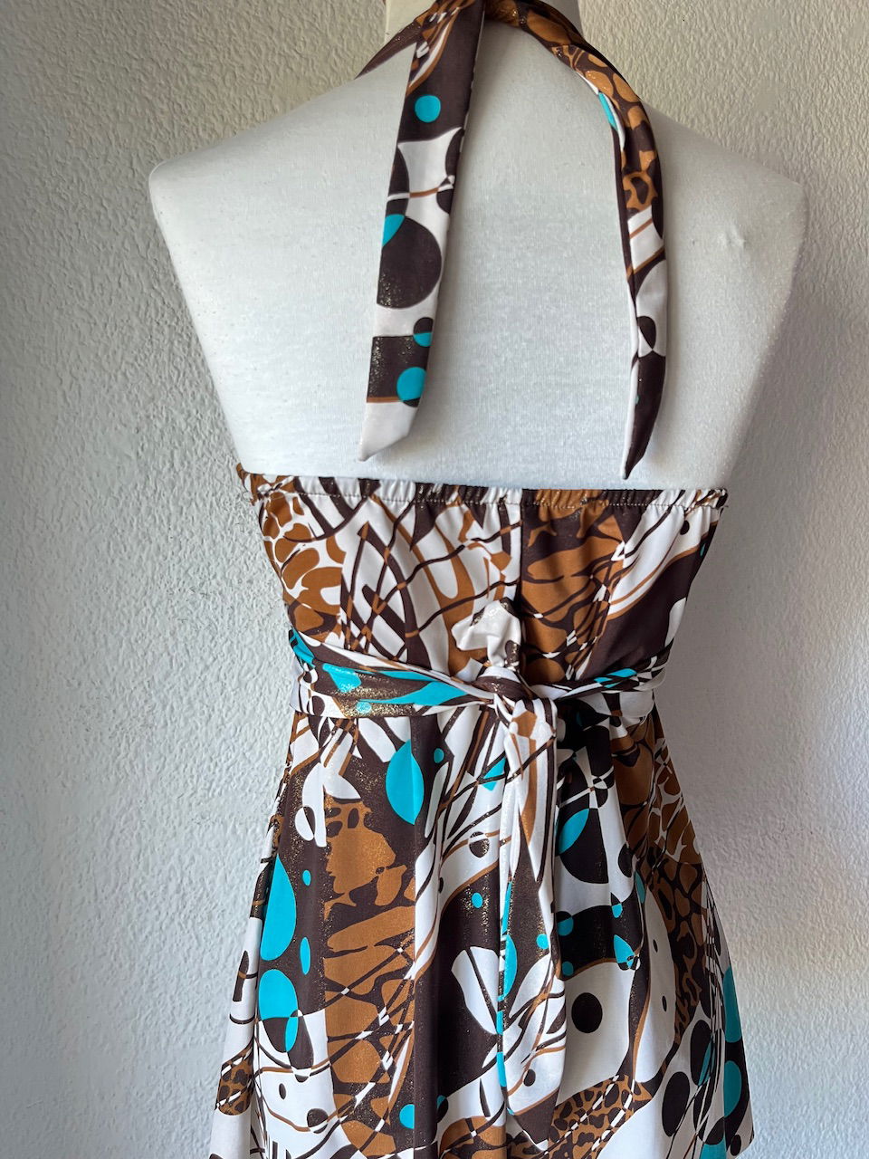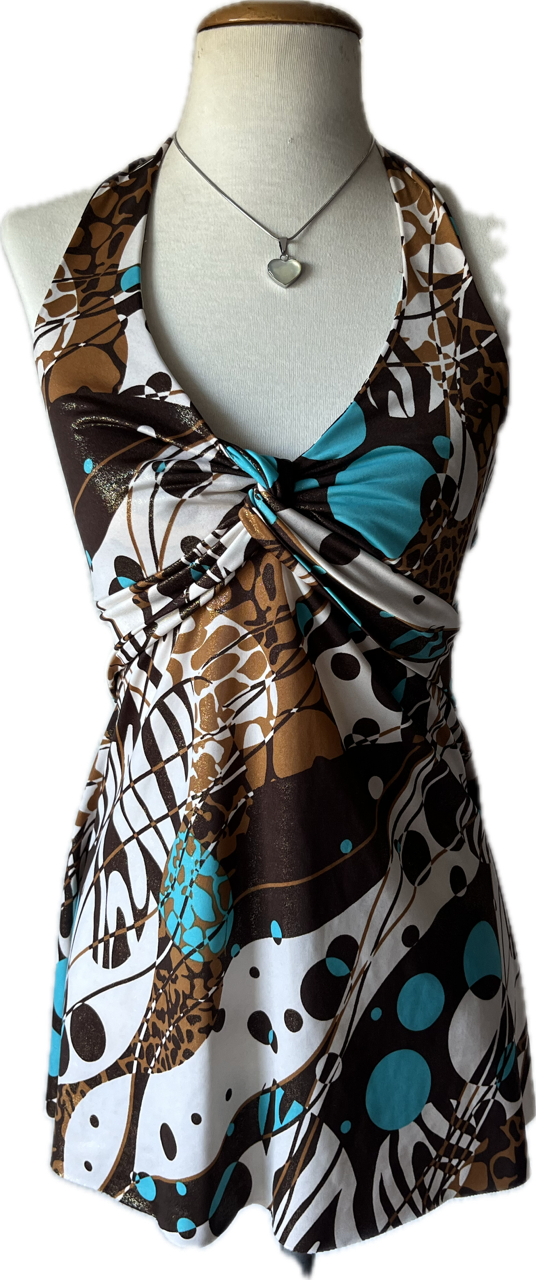mini vestido original de los 00s. es de espalda descubierta con escote estilo marylin. la tela tiene brillos y es combinada en chocolate y turquesa. talle s/m como nuevo