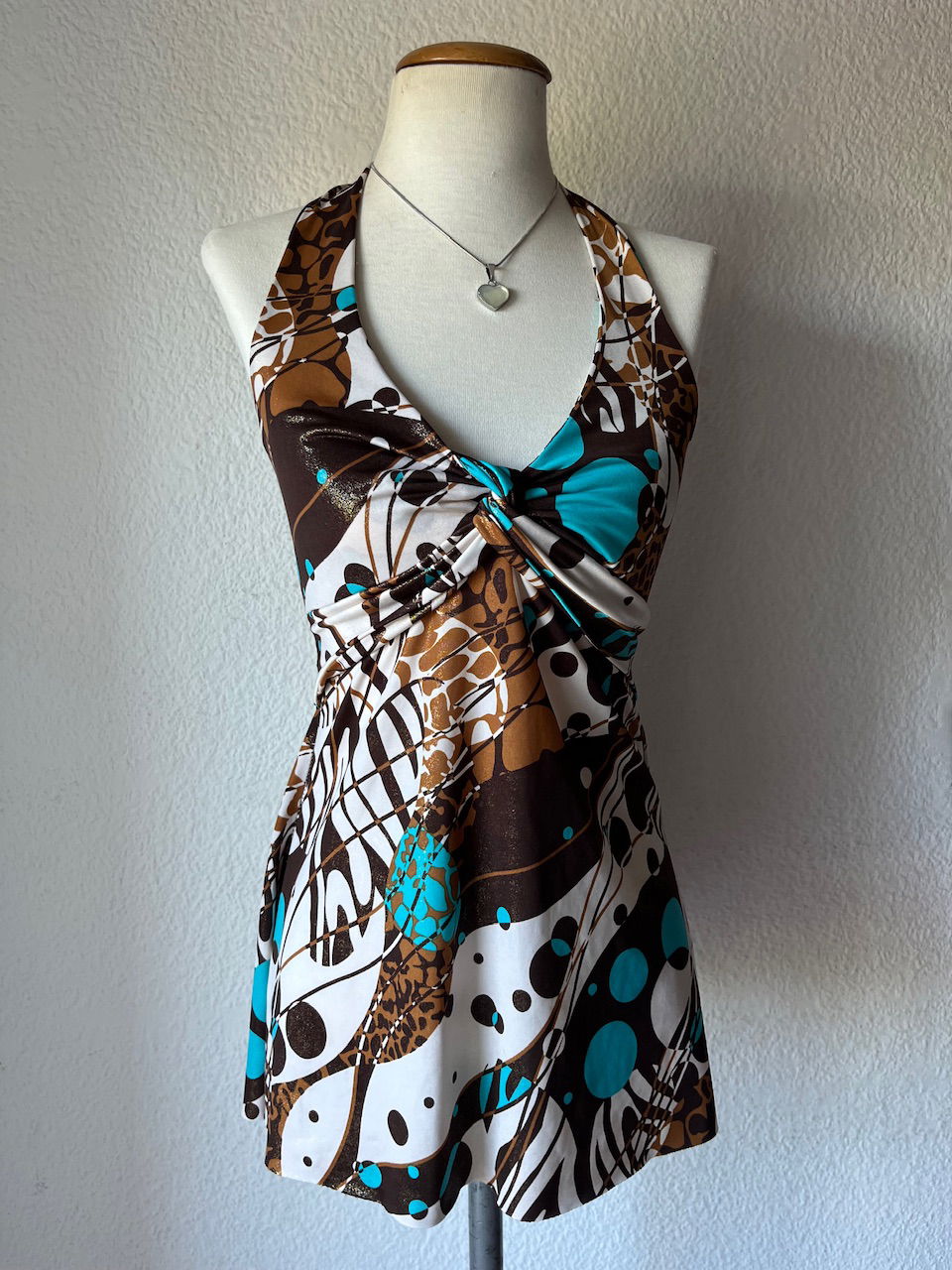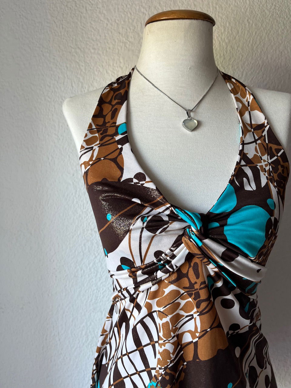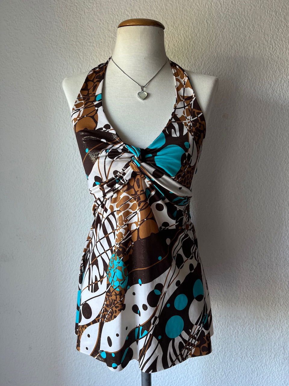 mini vestido original de los 00s. es de espalda descubierta con escote estilo marylin. la tela tiene brillos y es combinada en chocolate y turquesa. talle s/m como nuevo