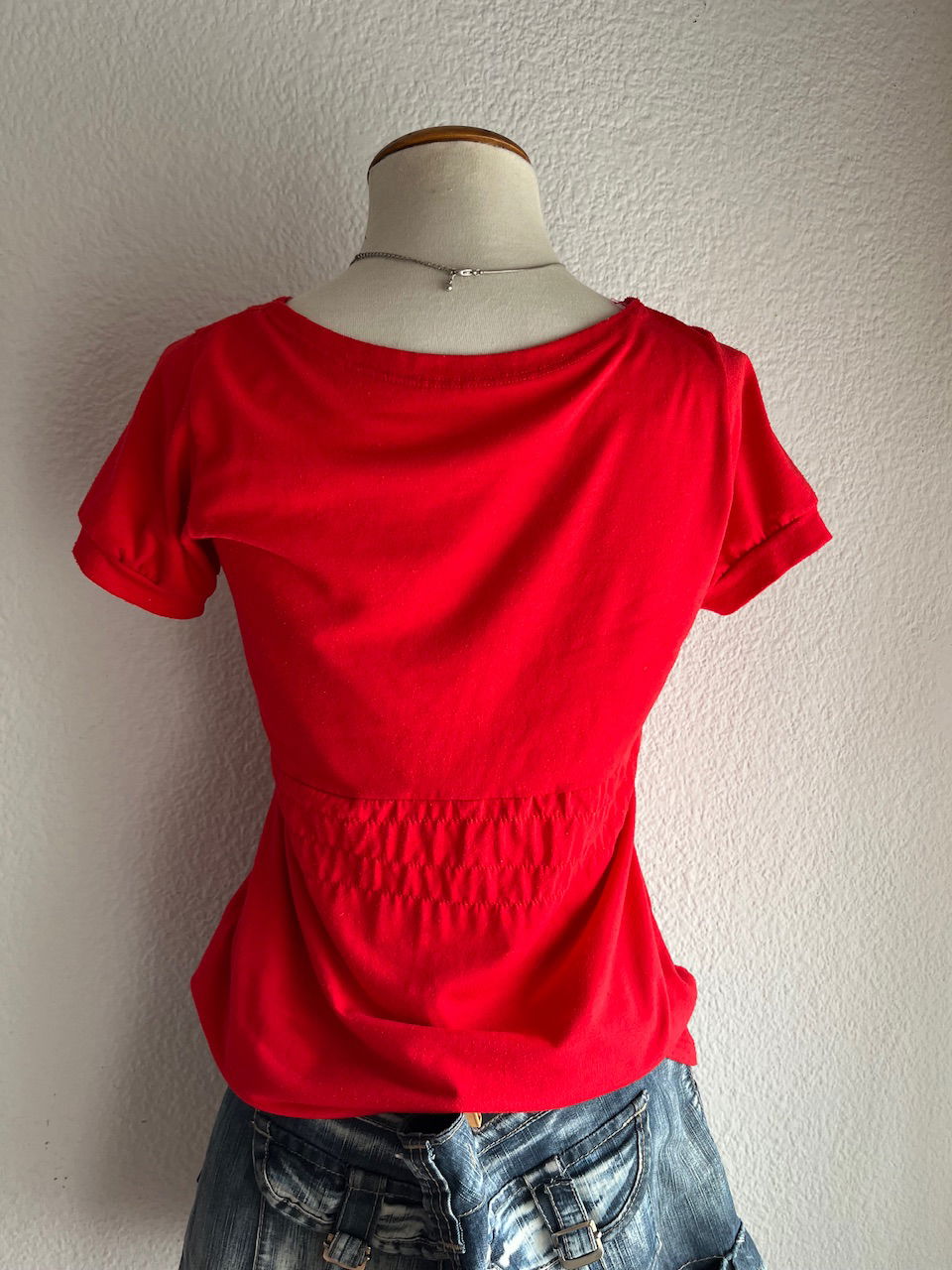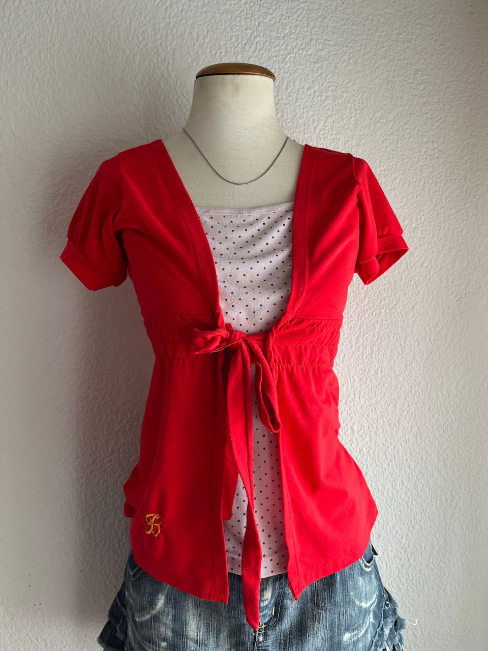 top súper cute en color rojo con detalle de lunares y lazo para ajustar en la cintura. talle m