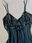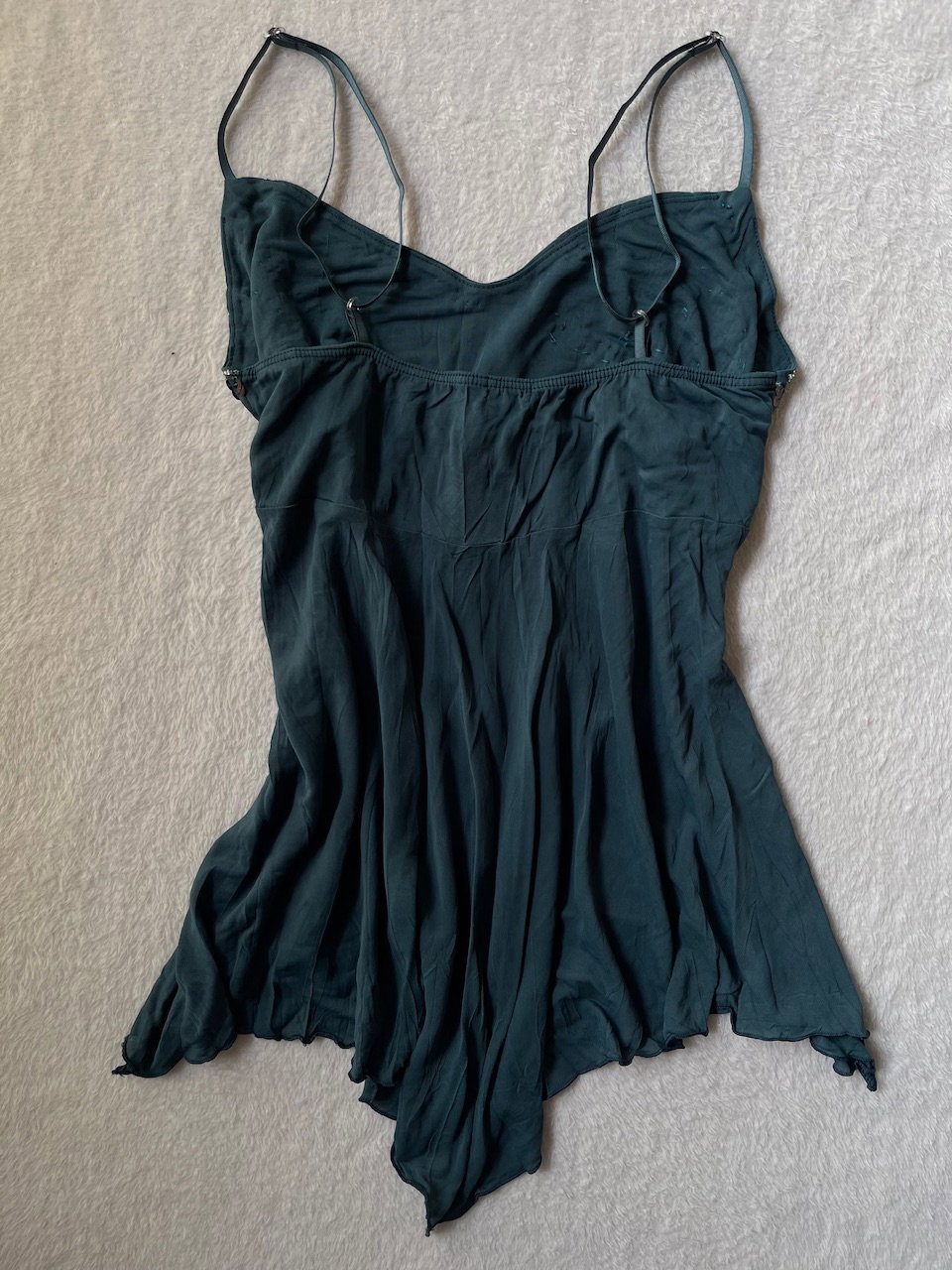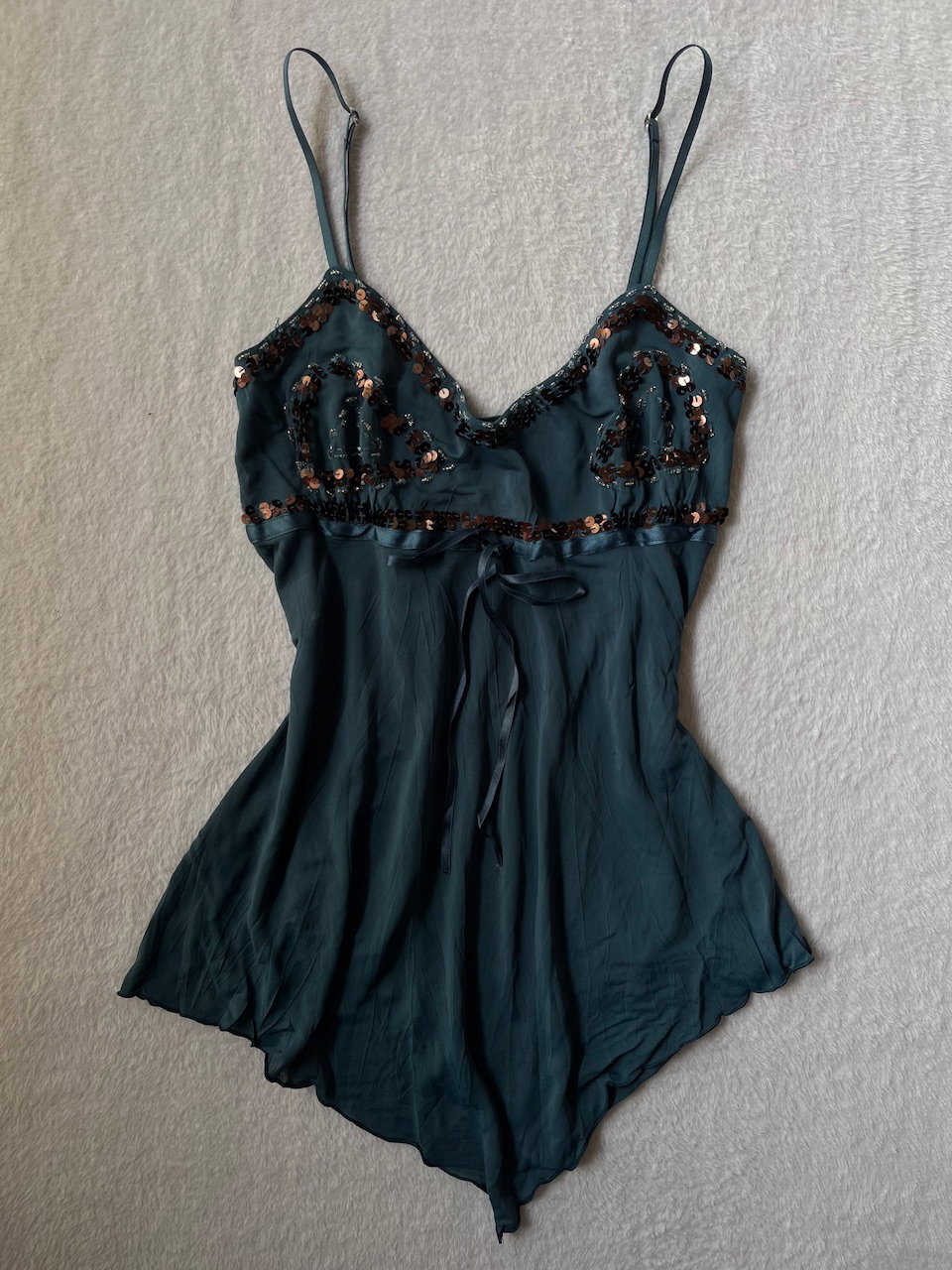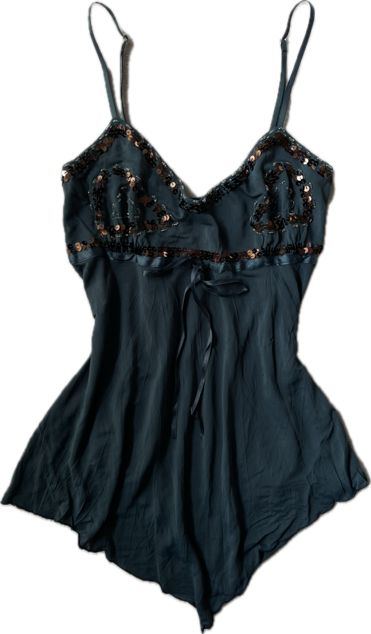 top estilo baby doll con corte asimétrico. cuenta con lentejuelas y mostacillas bordadas en el escote + un lazo en cinta de raso. el top es de lycra y tiene breteles regulables. color verde petróleo