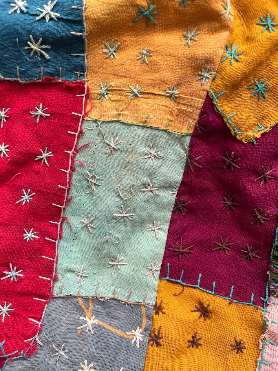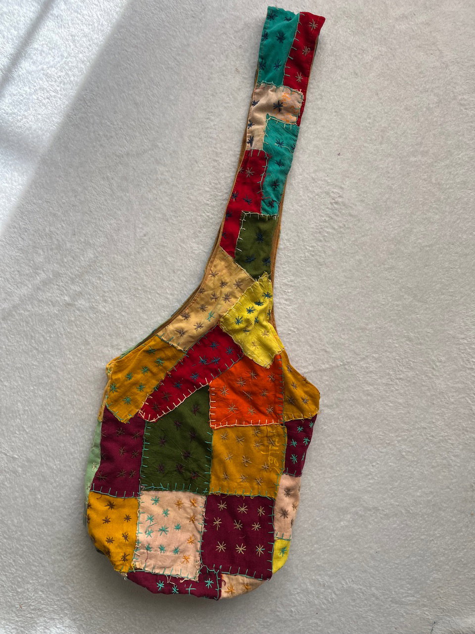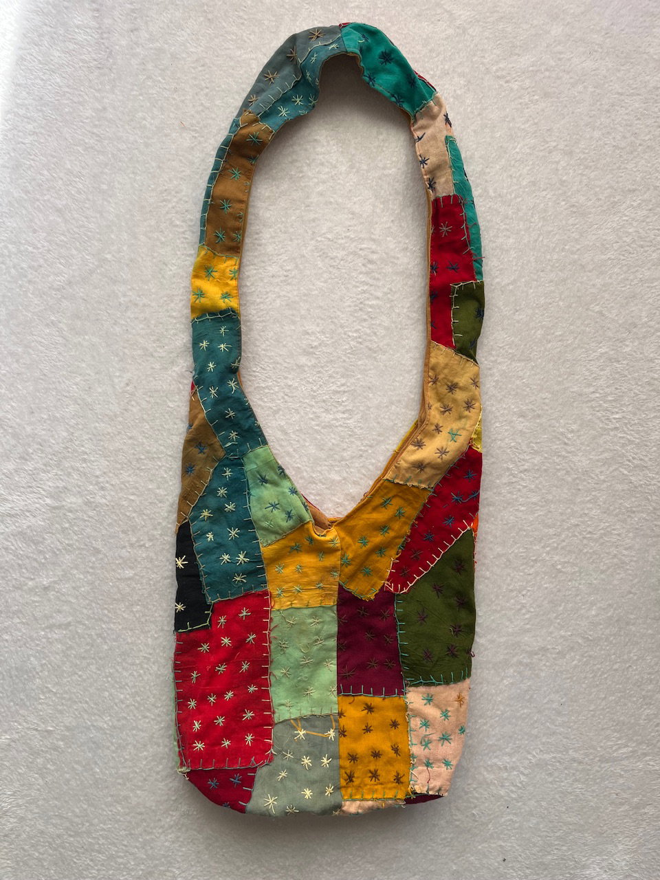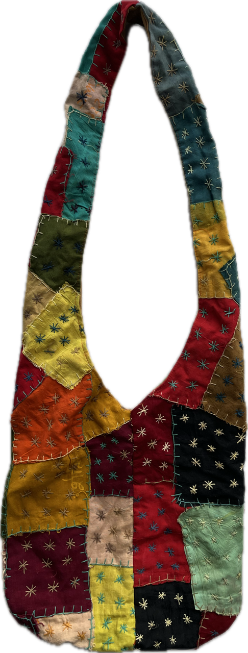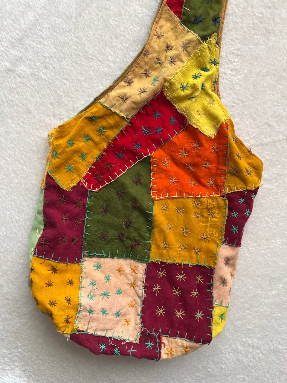 morral hecho a mano con distintos rectángulos de colores y bordados en color crema y verde agua. está forrado. buen estado general, tiene unos pequeños detalles de colores detallados en fotos